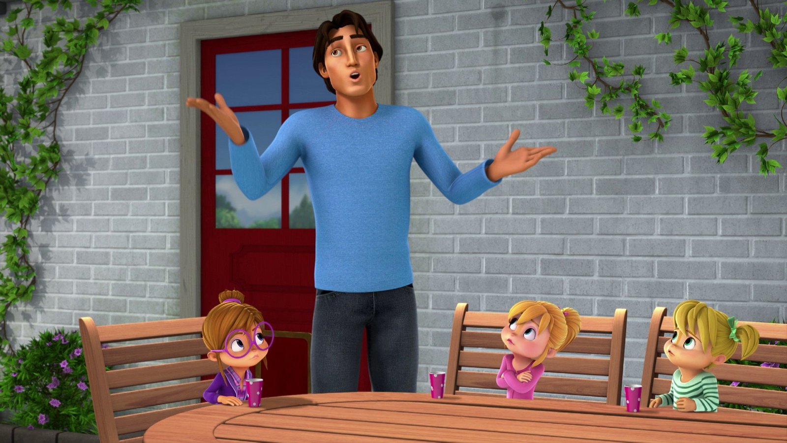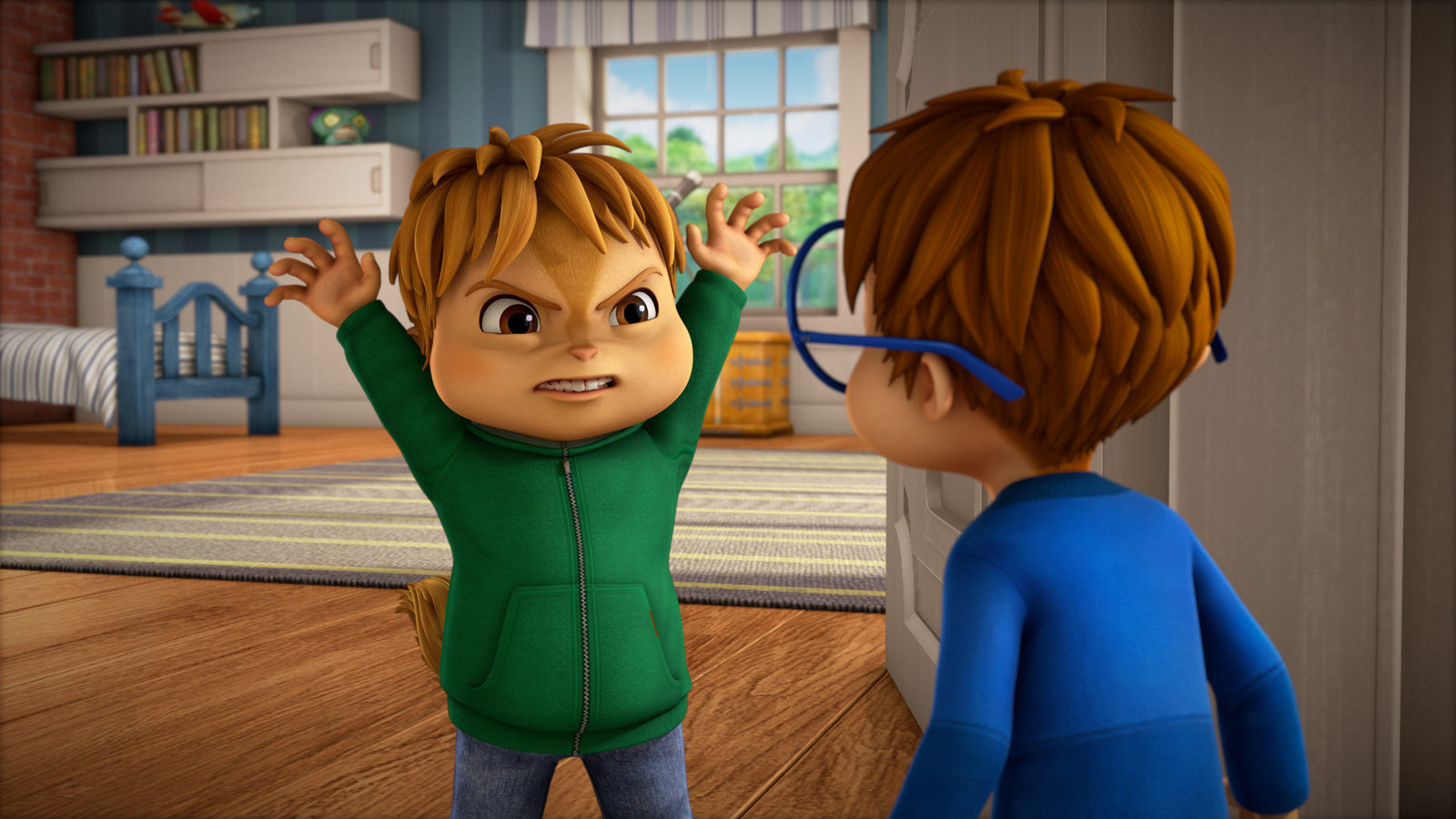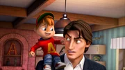 Nur ein kleiner GefallenAls Marianne (hinten l.) in Alvins (r.) Haus auftaucht, gerät die Sache für den frechen Chipmunk langsam außer Kontrolle. Auch Theodore (v.r.) ist mit seiner geheimen Doppelrolle sehr überlastet.Bild: © SUPER RTL