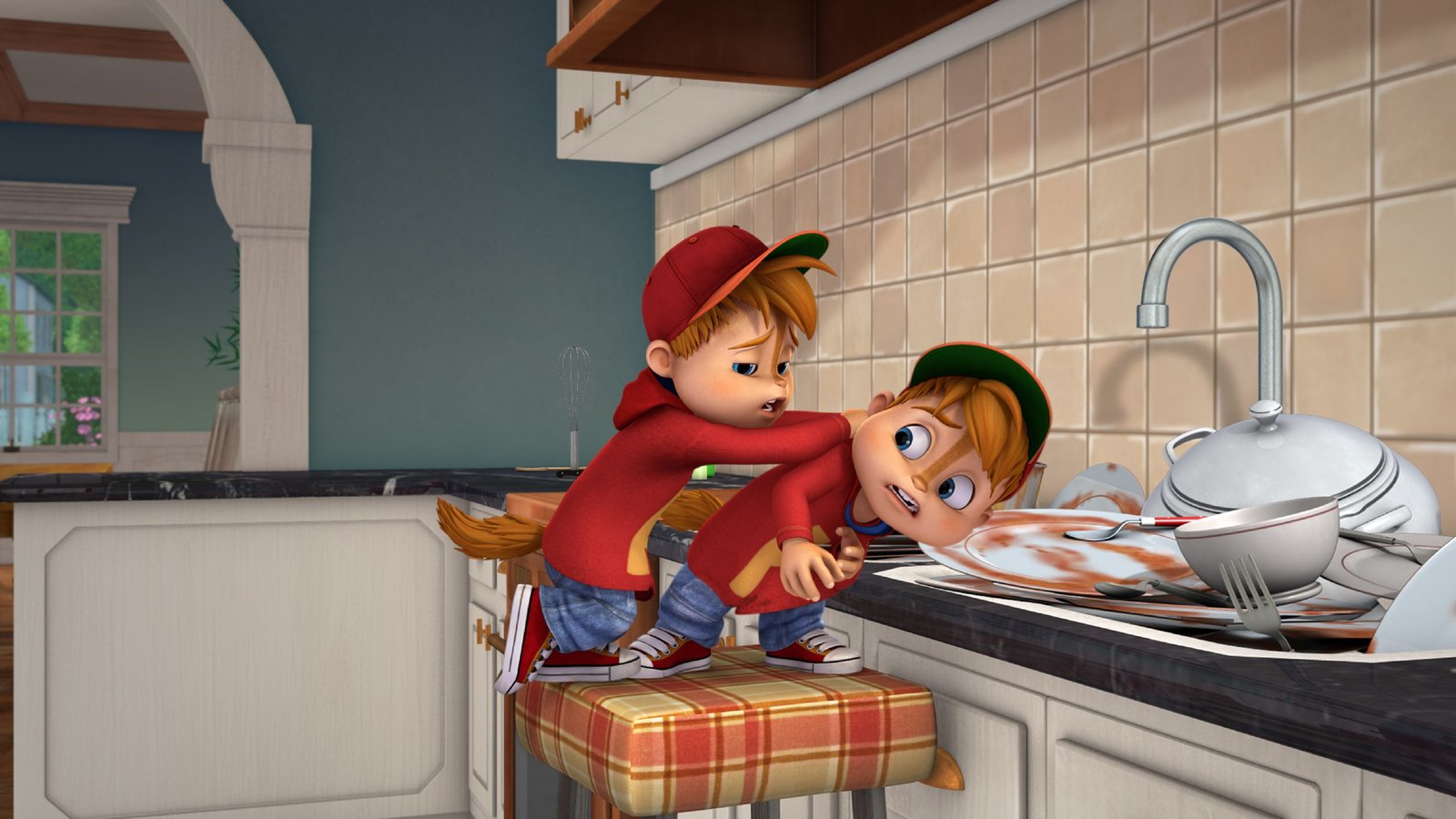 Der DoppelgängerAlvins Doppelgänger (r.) zerschmeist das Geschirr, anstatt es abzuwaschen. Das muss das der richtige Alvin unbedingt verhindern.Bild: © SUPER RTL