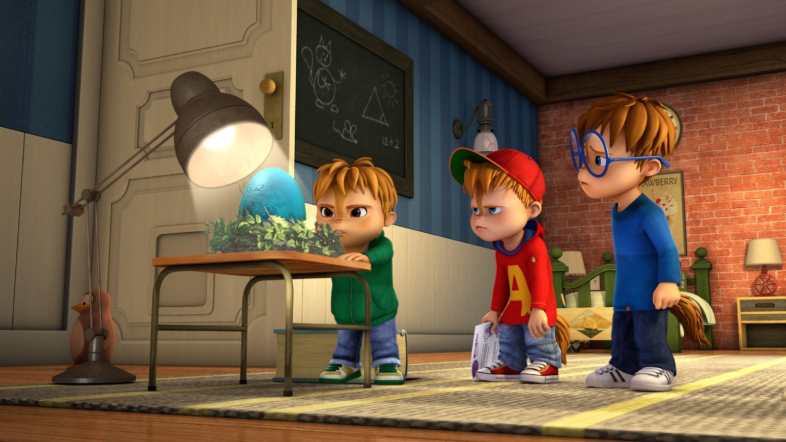 Ein Haustier für TheodoreTheodore (l.) hat sich ein Drachnei im Internet bestellt. Alvin und Simon (r.) machen sich über ihn lustig.Bild: © SUPER RTL