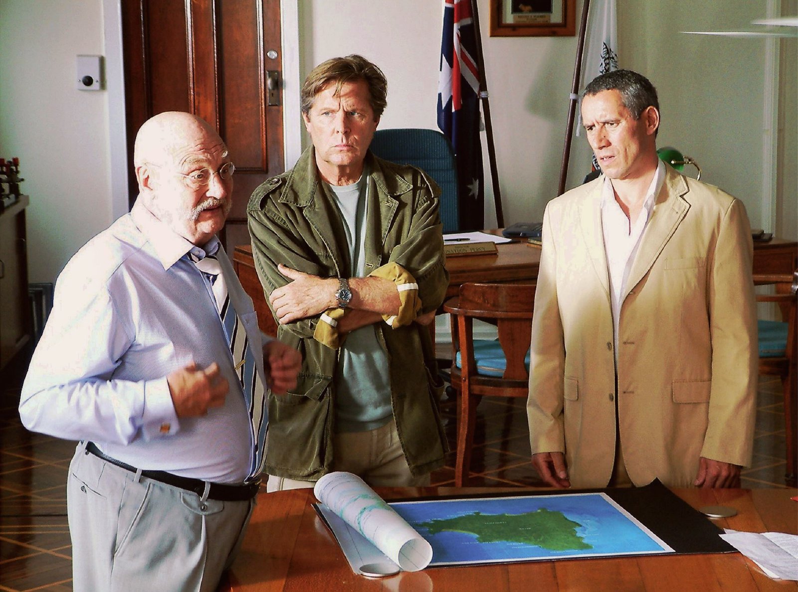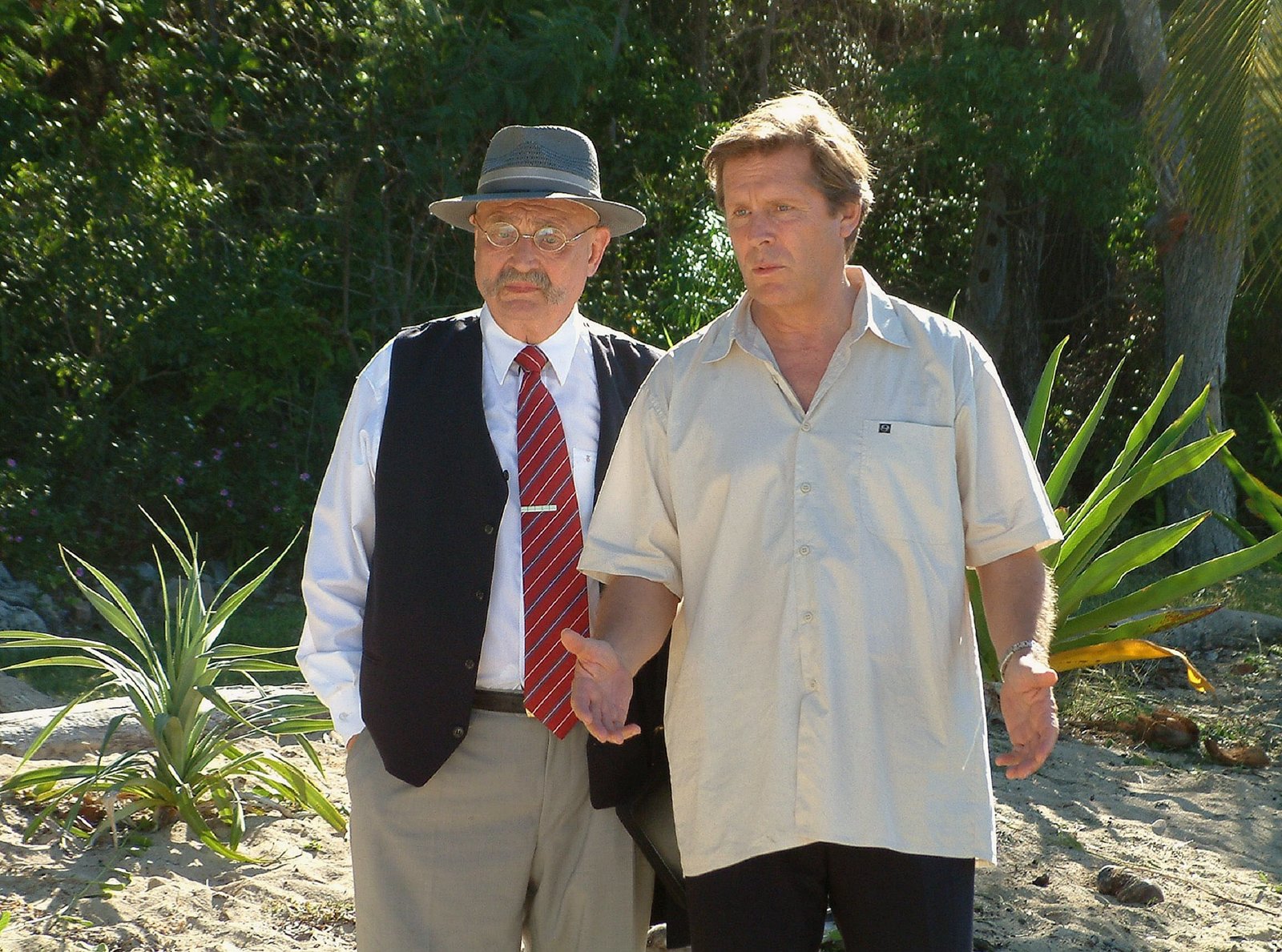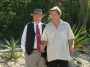 Am Kap der LiebeFerdinand Hansen (Rolf Hoppe, links) hat sich mit dem Spekulanten Phil Finch (Ralph Herforth, rechts) verbündet. Die beiden wollen, dass Jan Hansen (Sigmar Solbach) seine wunderschöne Insel Cook Island verkauft.Bild: © ARD Degeto