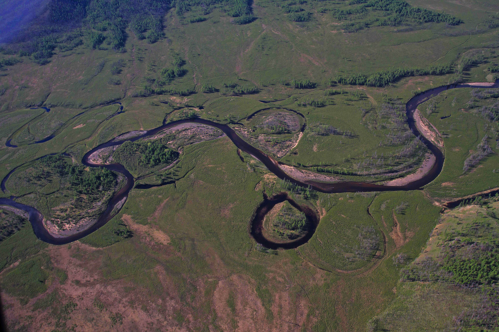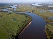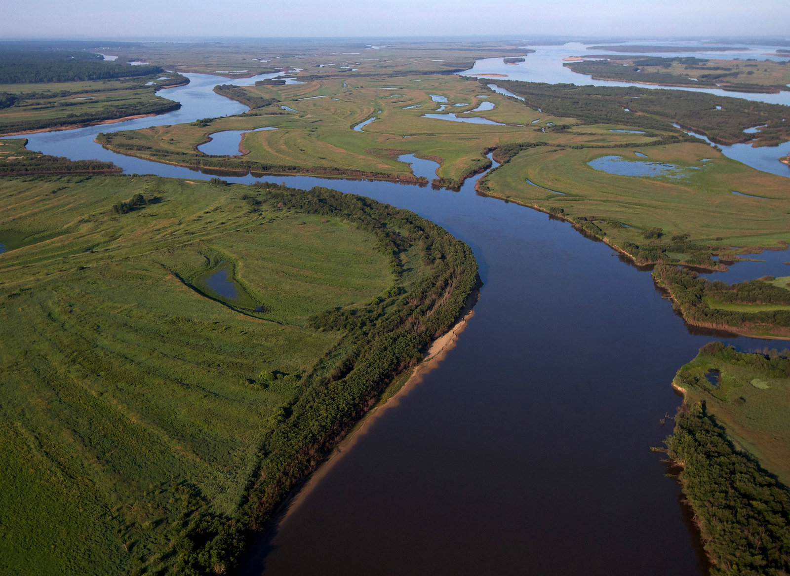Der ferne OstenLuftaufnahme des Amur: Der Fluss ändert regelmäßig seinen Lauf, wodurch Altarme entstehen.Bild: © ARTE France / © Terra Mater/Interspot/Franz Hafner