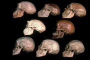 Prototyp MenschEwolucja cz?owieka, czaszki / Skulls of human evolution. On the top row are (left to right): Homo heidelbergensis (Bild: © Getty Images/Photo Researchers RM Lizenzbild frei