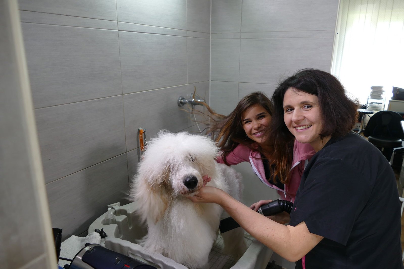 Ein Tag beim HundefriseurHundefriseurin Michaela zeigt Anna, dass man zum Trocknen einen besonders starken Fön braucht – einen sogenannten Blower.Bild: © BR/Text und Bild Medienproduktion GmbH & Co.KG/Karen Markwardt