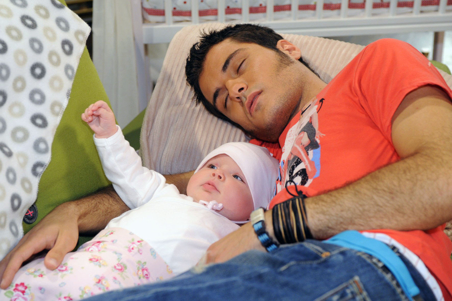 Flucht vor der VergangenheitMaja wird in Bezug auf Maiks Babysitterqualitäten eines Besseren belehrt. v.l.n.r.: Pia (Marlene Thiele), Maik (Sebastian König)Bild: © Sat.1 / Oliver Ziebe