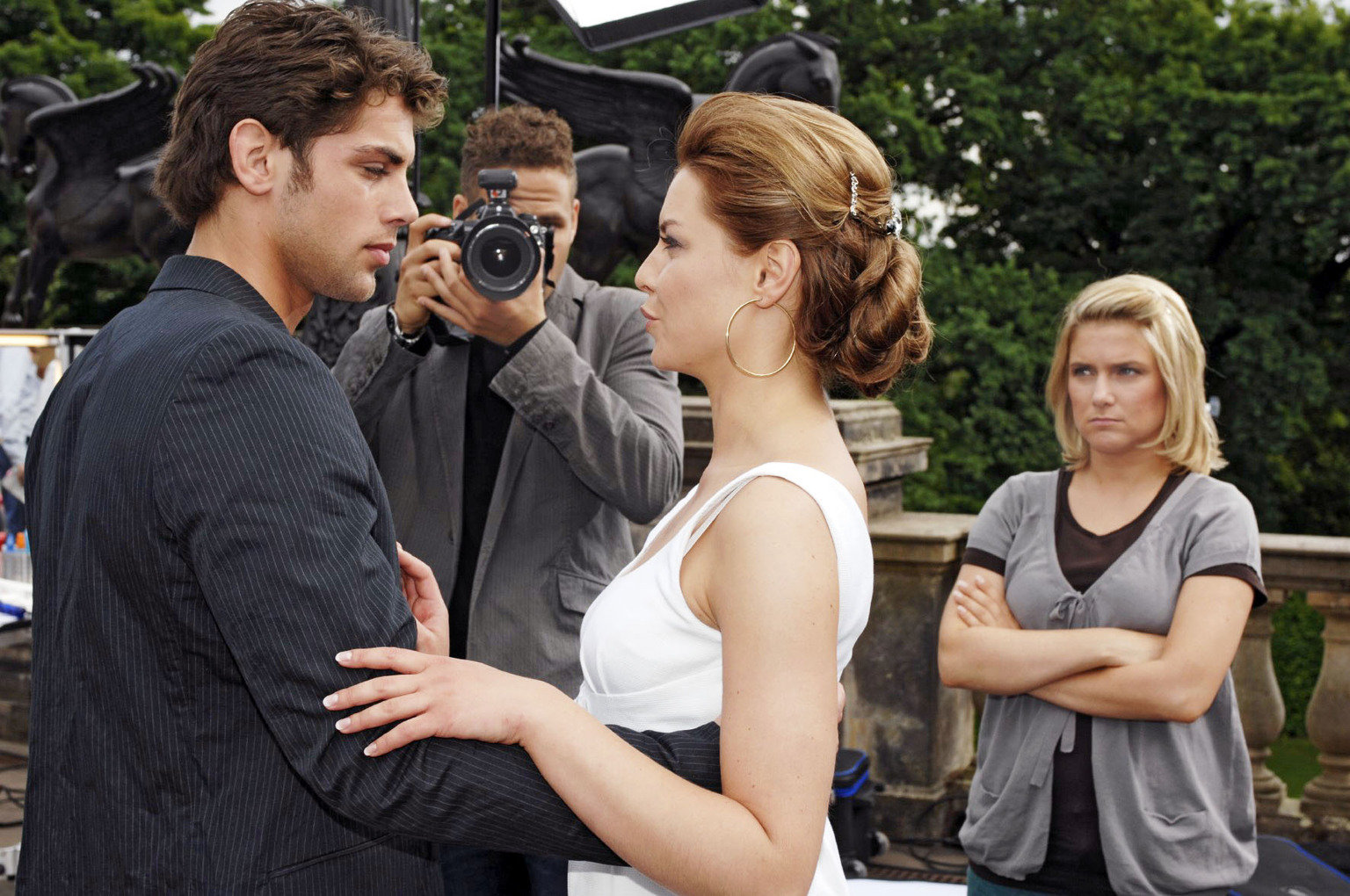 Hoch explosivLily (Jil Funke, r.) muss sich eingestehen, dass der Kuss sie nicht kalt gelassen hat, aber sie macht Jojo (Bernhard Bozian, l.) klar, dass sie mit Lars (Alexander Klaws, M.) verheiratet ist und er sich keine Hoffnungen machen soll ...Bild: © SAT.1 Eigenproduktionsbild frei