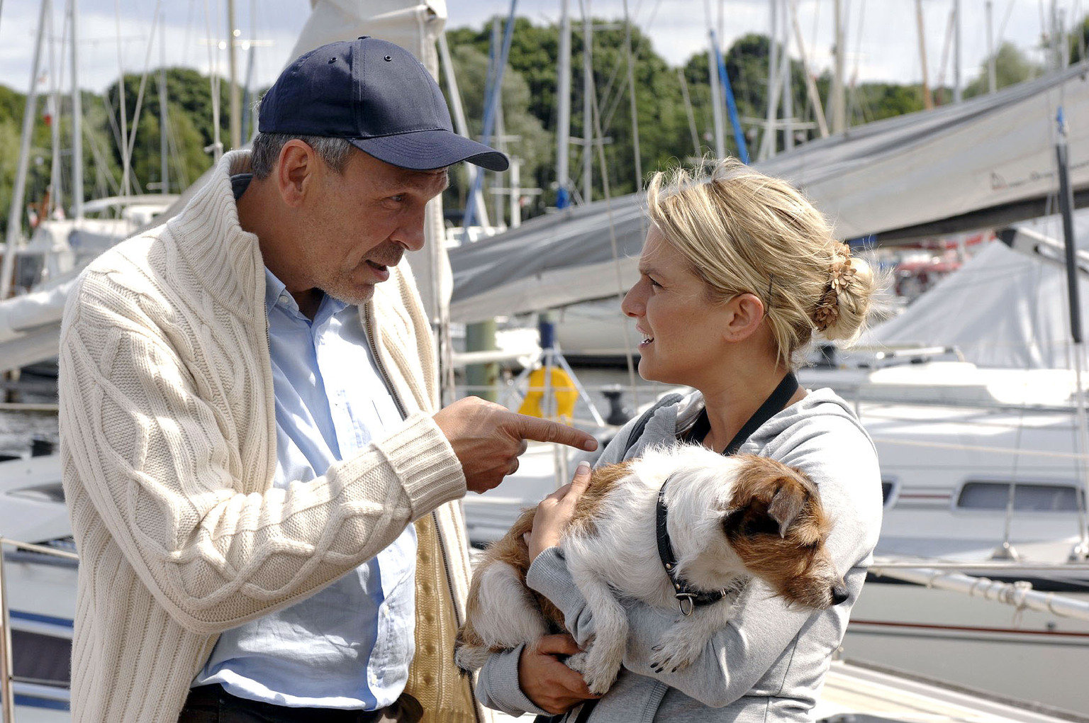 Zu früh gefreutAnna (Jeanette Biedermann, r.) bringt den Hund des Yachtbesitzers (Matthias Dittmer, l.) zurück und kommt mit diesem ins Gespräch.Bild: © Puls 8