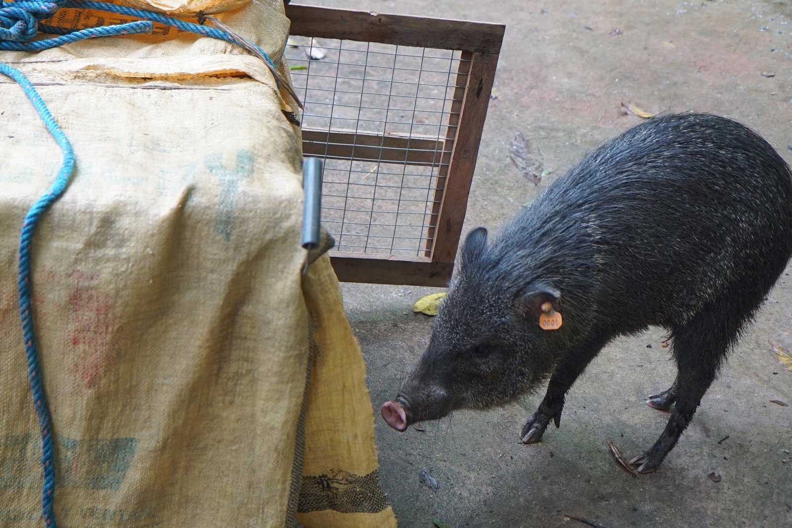 Pekaris sind auch SchweineHalsbandpekari Gino vor seinem Transportkäfig. Hier muss er rein, wenn er in die Freiheit fahren will.Bild: © BR/Text+Bild Medienproduktion GmbH & Co. KG