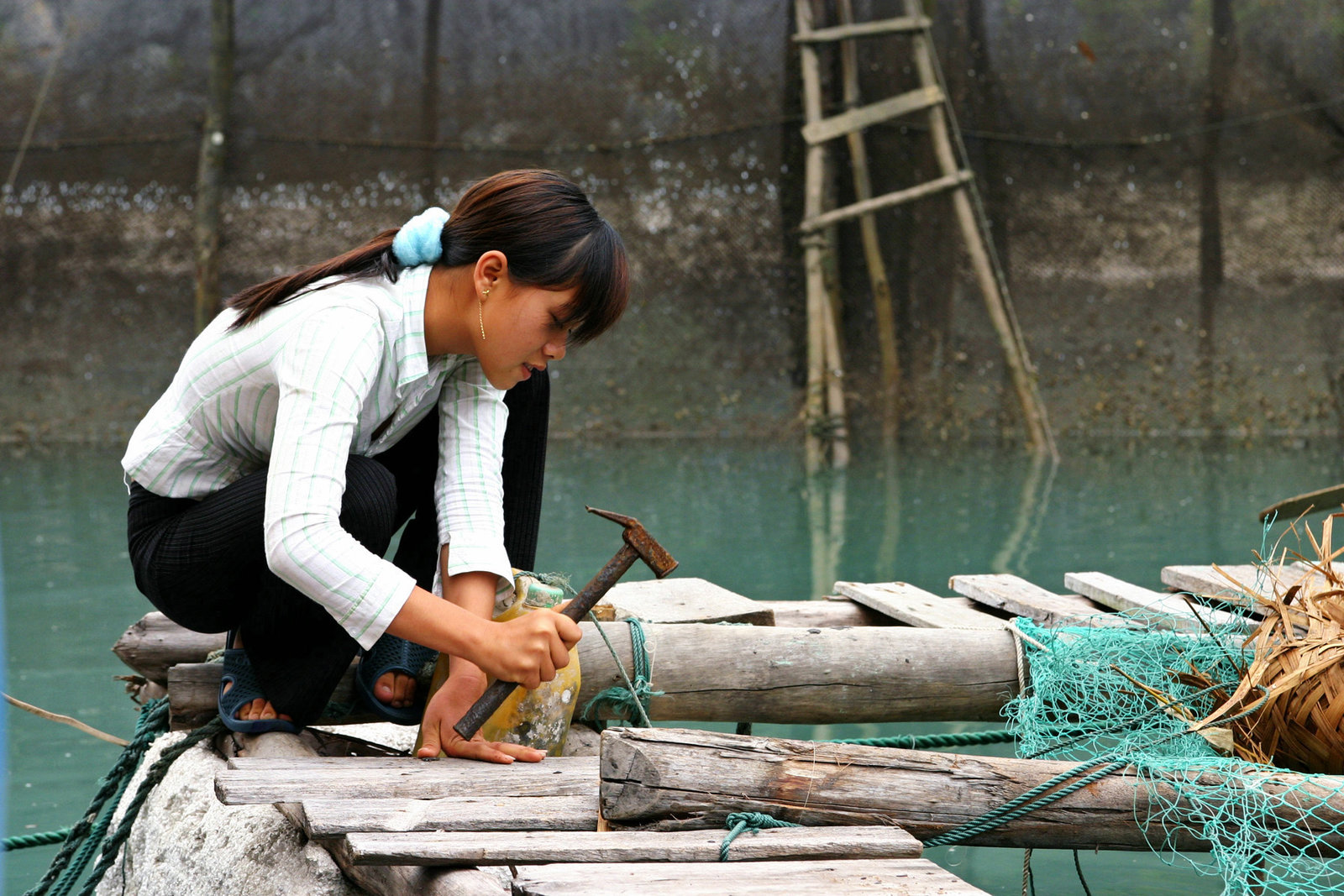 Die schwimmenden Dörfer der Ha Long BuchtDas Salzwasser lässt das Holz der schwimmenden Häuser und Stege schnell morsch werden. Reparaturen sind deshalb an der TagesordnungBild: © ARTE / © Medienkontor FFP