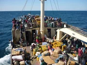 Tanganjikasee: Vom Kanonenboot zum PassagierschiffJeder Zentimeter Platz an Deck wird genutzt - die "Liemba" ist oft überladen.Bild: © ARTE / © MedienKontor/Stefan Richts