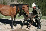 Die neuen Nomaden von KirgisistanBachit hilft dem gerade erst geborenen Hengst auf die Beine. Für Mutter und Kind muss der Marsch bereits ein paar Stunden nach der Geburt weitergehen.Bild: © ARTE