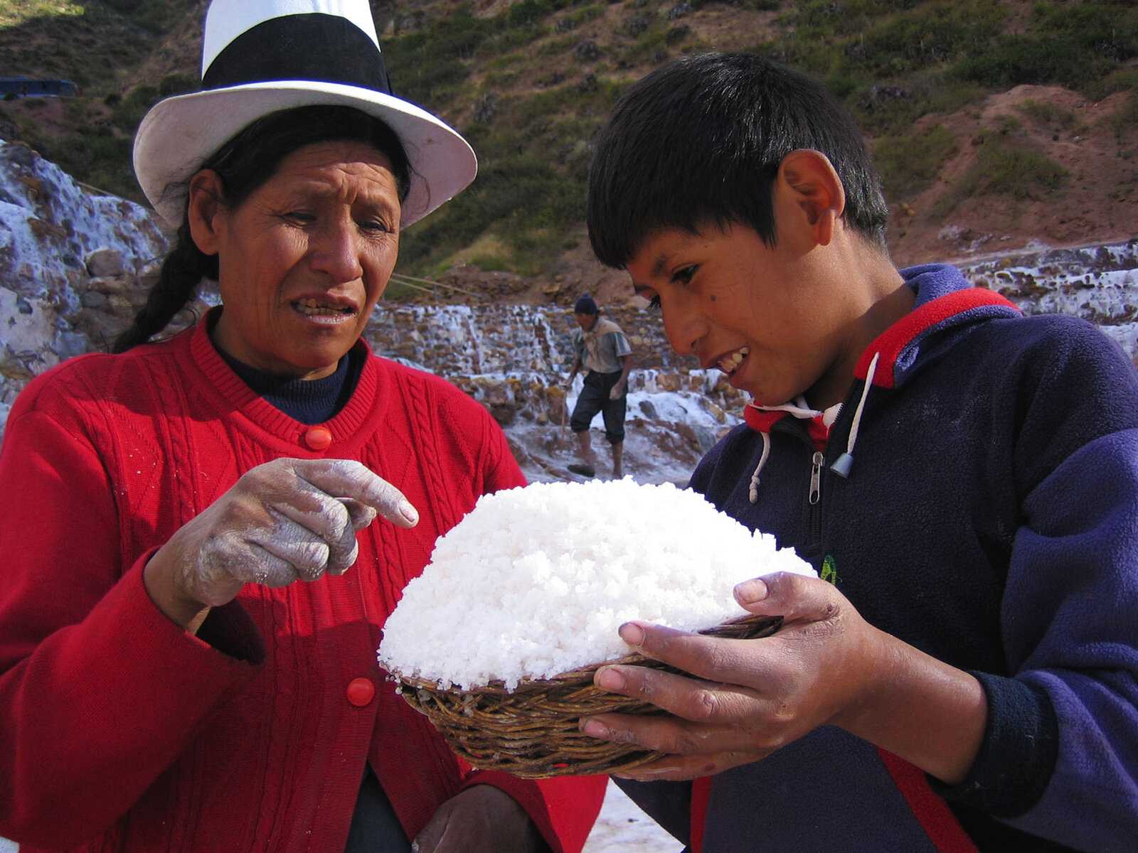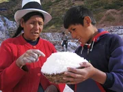 Das Salz der InkaEmilia Atapaucar erklärt ihrem Sohn Jonathan die verschiedenen Qualitätsstufen von Salz.Bild: © arte