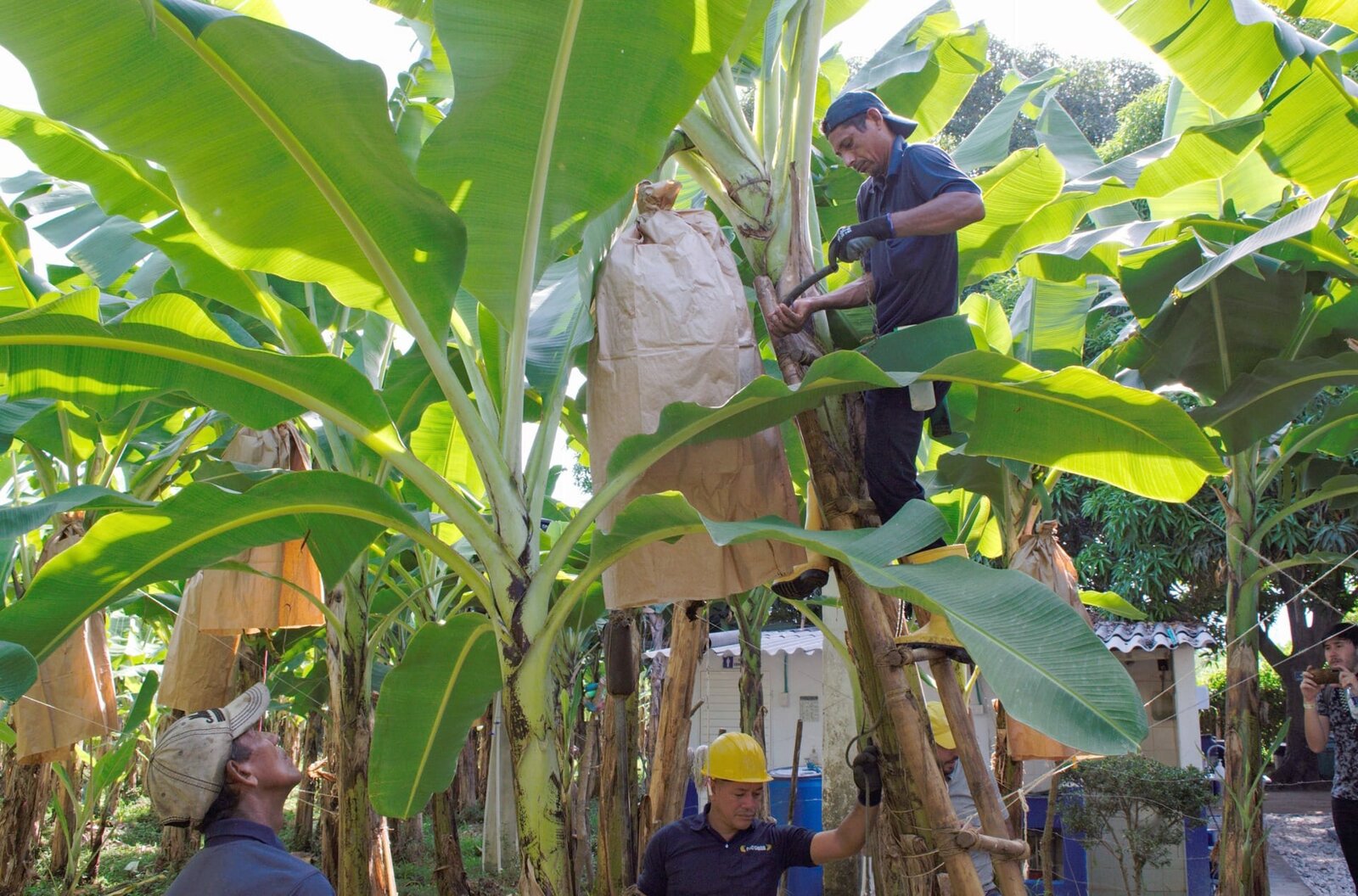 Tropenfrüchte ohne Reue - Ökologisch, fair und leckerAuf den Farmen von Dominique Bananas im kolumbianischen Santa Marta werden Bananen in Papier- statt in Plastiksäcken geschützt.Bild: © ZDF / © Jörg Laaks / © Jörg Laaks
