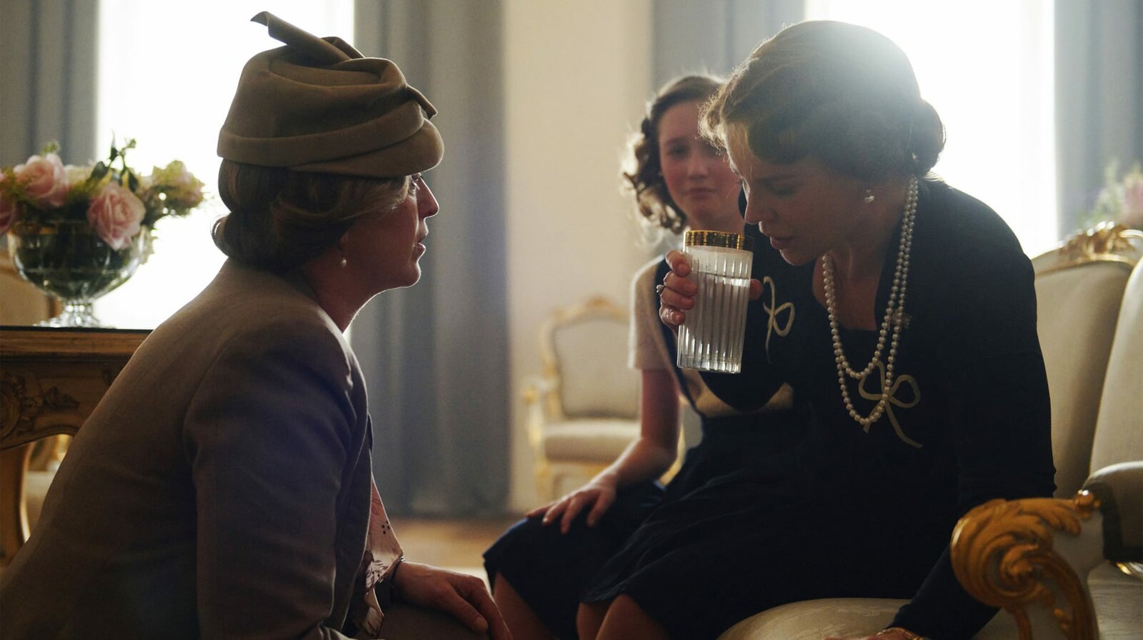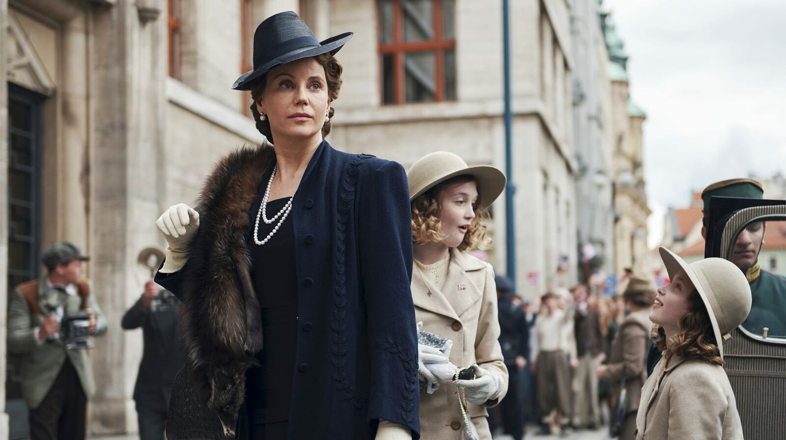 Folge 2Kurz vor der Pressekonferenz erleidet Kronprinzessin Martha, gerade in Amerika angekommen, einen Schwächeanfall. (im Bild v.l.n.r.: Anneke von der Lippe, Leonora Eik, Sofia Helin)Bild: © NDR/Julie Vrabelová / NDR Presse und Information