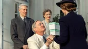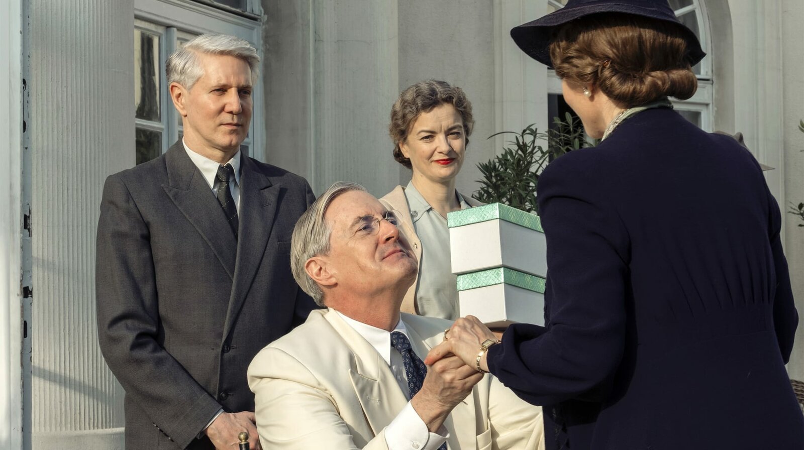 Folge 1Unter den Augen des Agenten Jones und seiner Mitarbeiterin Missy LeHand empfängt Roosevelt Märtha und ihre Kinder. (v.l.n.r.: Roy McCrerey, Kyle MacLachlan, Lucy Russell, Sofia Helin)Bild: © NDR/Dusan Martincek / NDR Presse und Information
