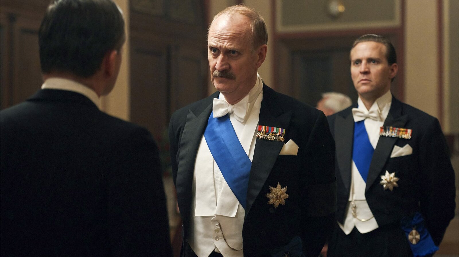Folge 3König Haakon (Mitte: Søren Pilmark) und Kronprinz Olav (rechts: Tobias Santelmann) lassen sich von den aktuellen politischen Entwicklungen berichten.Bild: © NDR/Julie Vrabelová / NDR Presse und Information