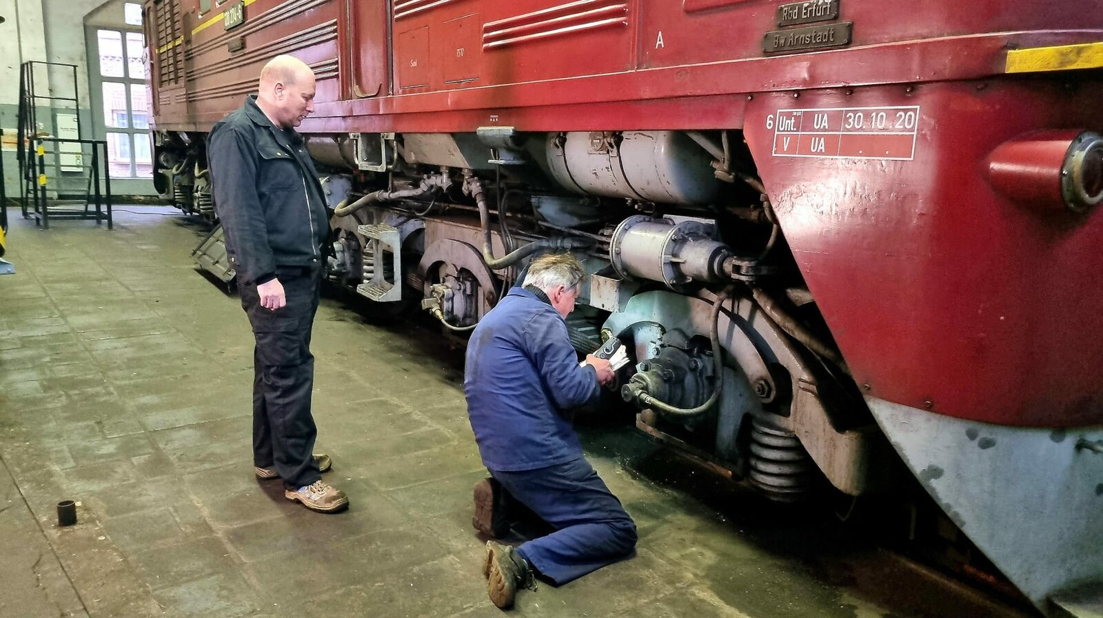 Andreas Drache (l.) und Andreas Altmann (r.) bereiten die Lok auf eine Fristuntersuchung vor, vergleichbar mit einer TÜV-Prüfung beim Auto.Bild: © MDR