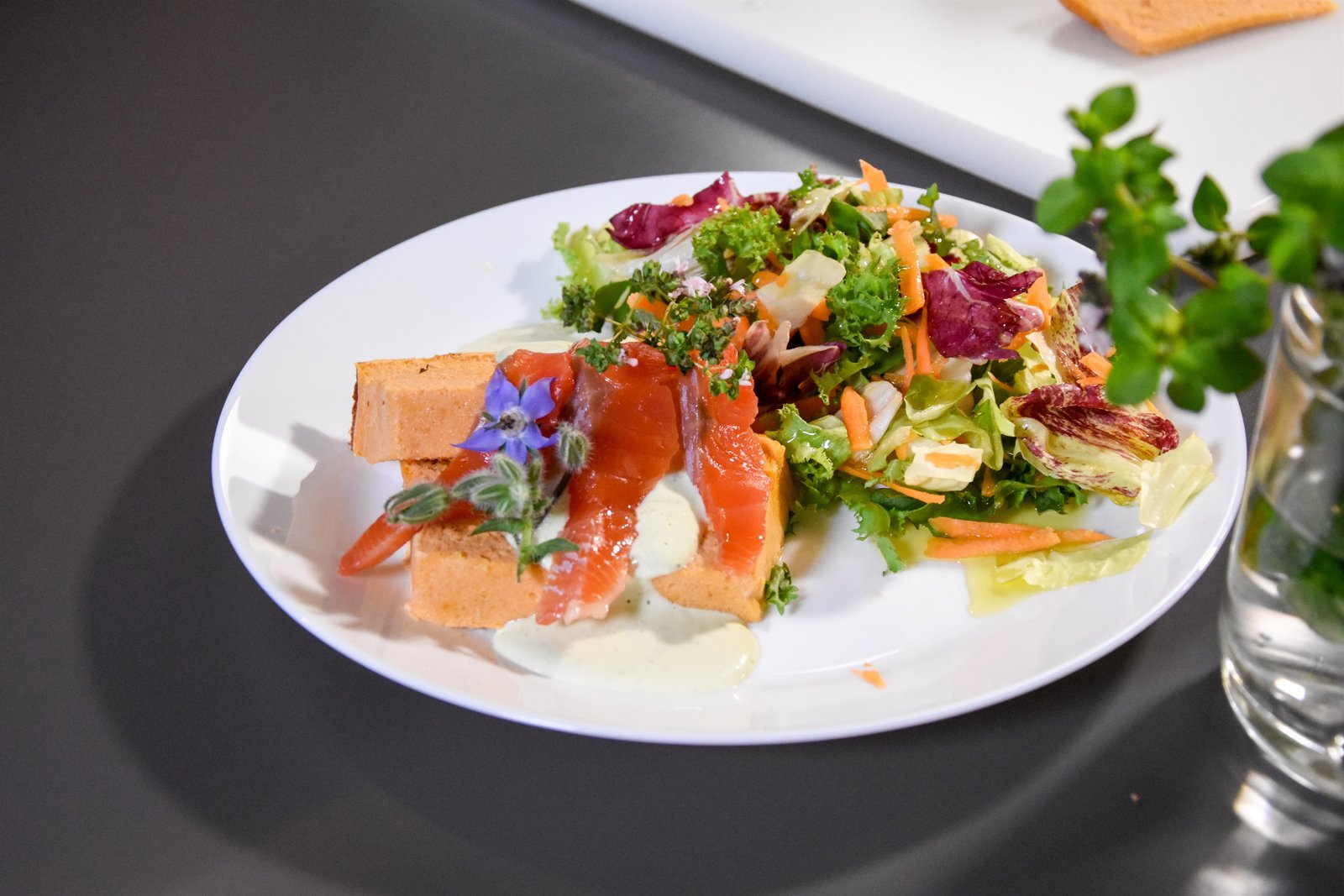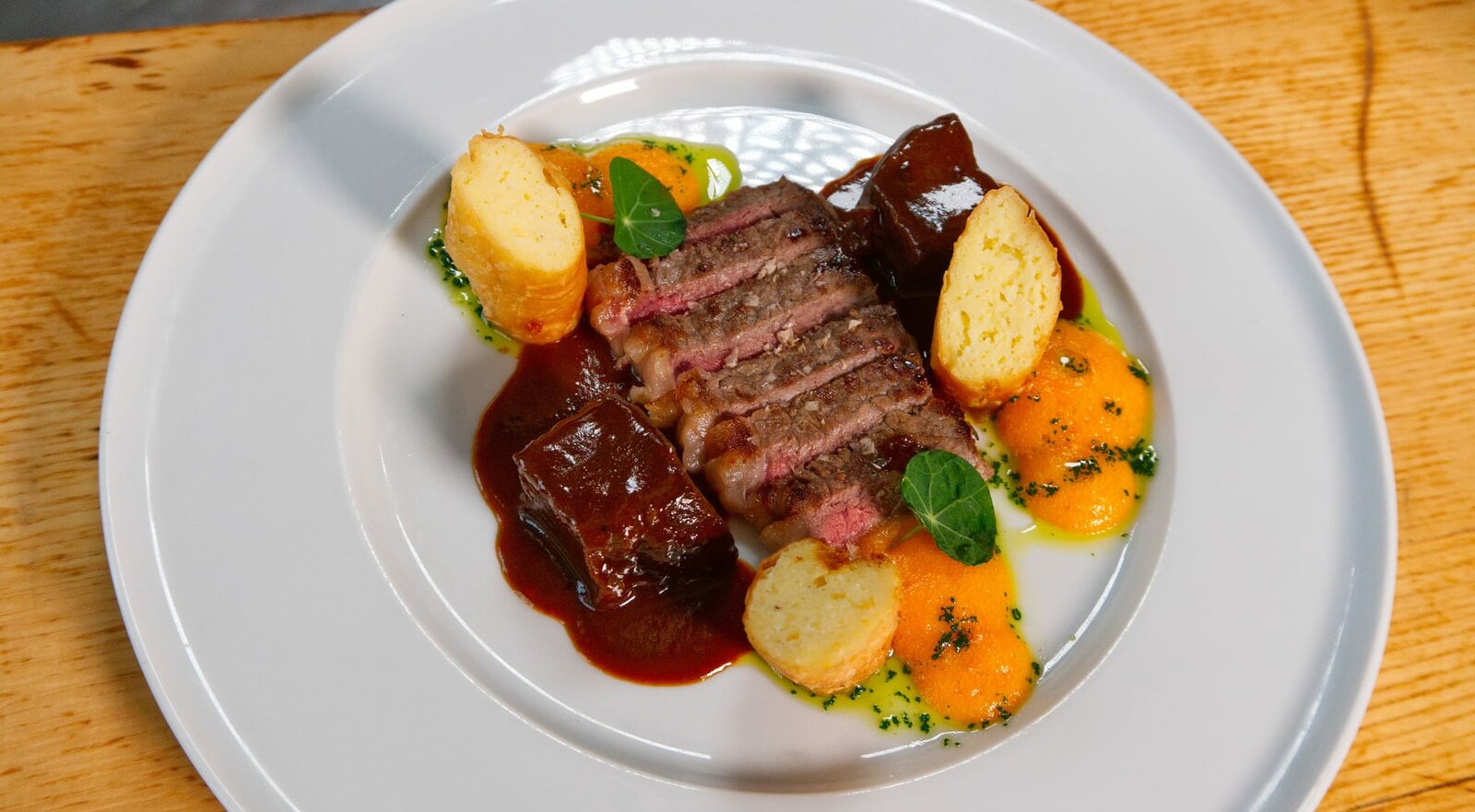 Der SemmeringAufgetischt Gericht von Matthias Weinzettl im Alpenstrandbad Edlach: Geschmorte Rindsbackerl mit Grießstrudel, Karotten-Sezuan-Schaum und Eberrautenöl.Bild: © ORF/Satel Film/Manfred Hoschek