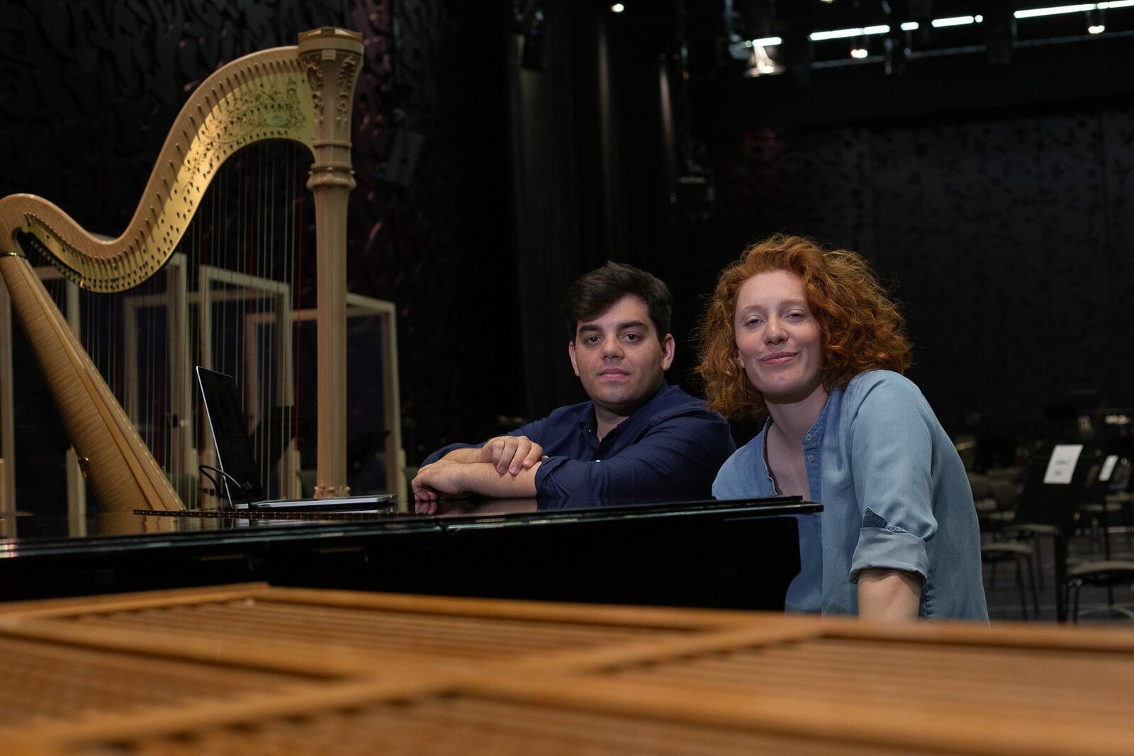 Grazer GrünSounddesigner und Komponist Carlos Rodriguez und Sängerin Anna Heimrath arbeiten im Grazer Mumuth an den Klängen für ein Videospiel.Bild: © ORF/Satel Film/Katharina Heigl