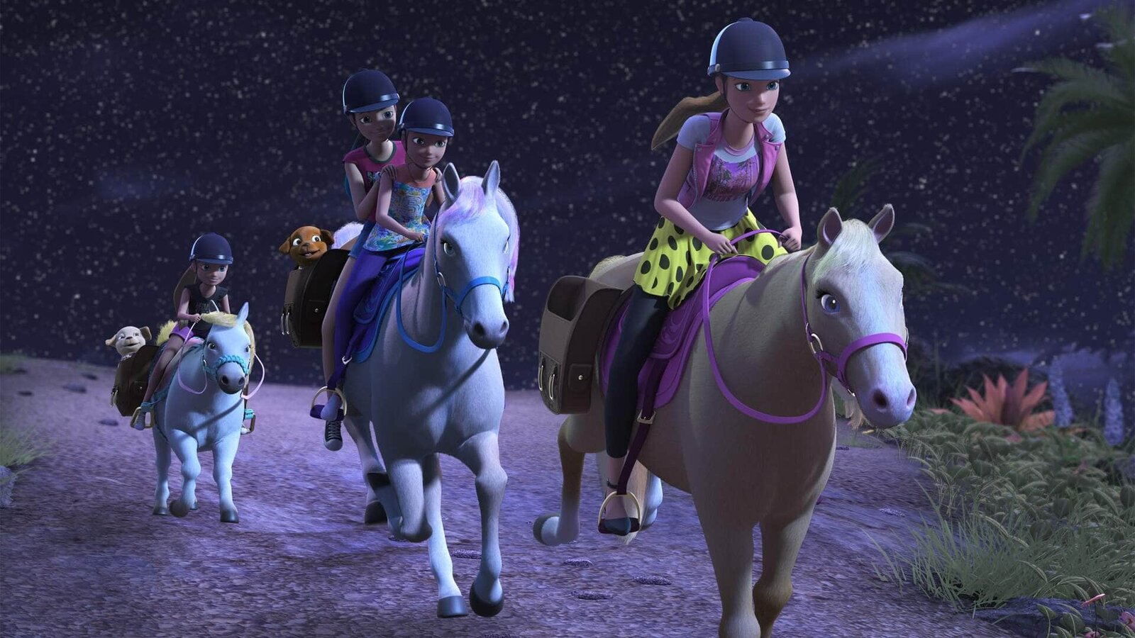Die HundesucheBarbie (vorne) und ihre Schwestern machen gemeinsam mit ihren Welpen und den Pferden einen nächtlichen Ausritt, begleitet von den leuchtenden Sternen am Himmel.Bild: © Universal Studios Inc.