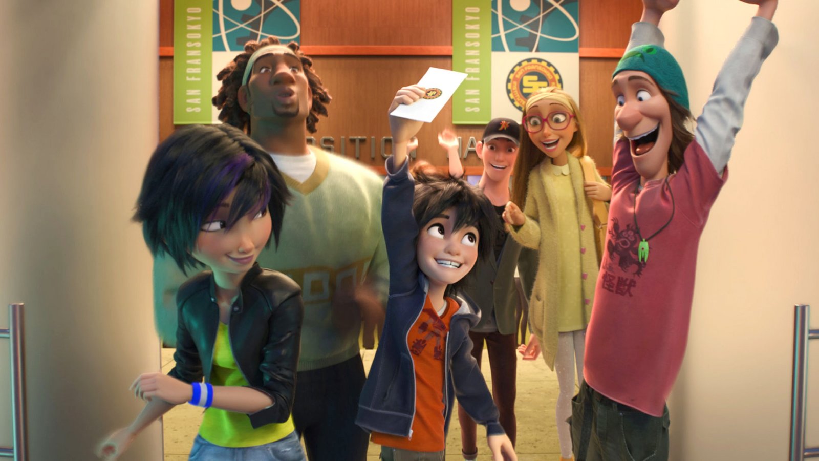 GoGo (l.), Wasabi (2.v.l.), Tadashi (3.v.r.), Honey Lemon (2.v.r.) und Fred (r.) freuen sich mit Hiro (M.), dass er in das Forschungs-Programm aufgenommen wurde.Bild: © MG RTL D / ©Disney Enterpr
