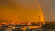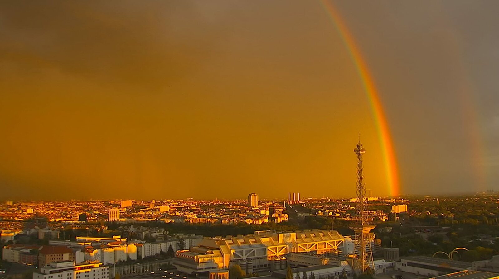 Die spektakulärsten Wetterphänomene in BerlinKatastrophenwinter, Jahrhundertregen, Hitzerekord - immer wieder halten unglaubliche Wetterphänomene Berlin in Atem. Die Meteorologen Dr. Katja Horneffer und Donald Bäcker sowie Prominente wie Claudia Schmutzler und Jaecki Schwarz blicken auf die spektakulärsten Wetterereignisse der vergangenen Jahrzehnte. - Ein Regenbogen in Berlin.Bild: © rbb