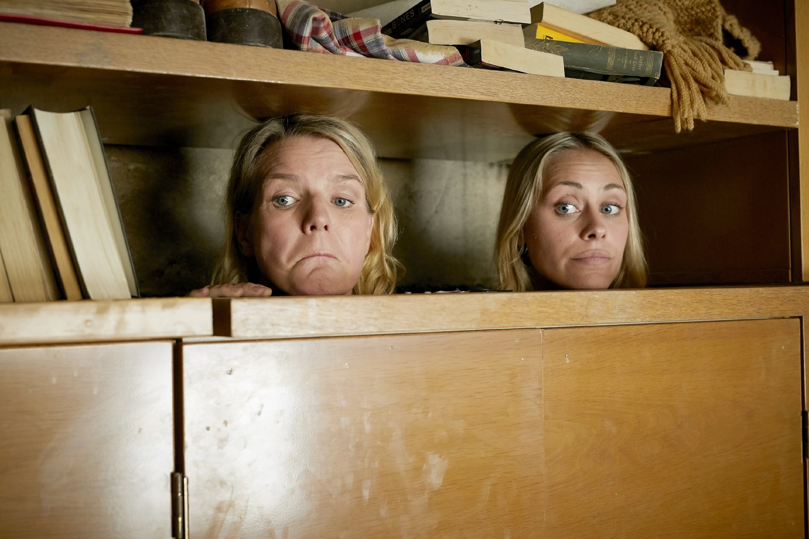 Das EiEva (Mirja Boes, l.) und Toni (Sina Tkotsch) sind in einem Klappbett eingeklemmt, aber Hilfe ist nicht in Sicht.Bild: © MG RTL D / Guido Engels