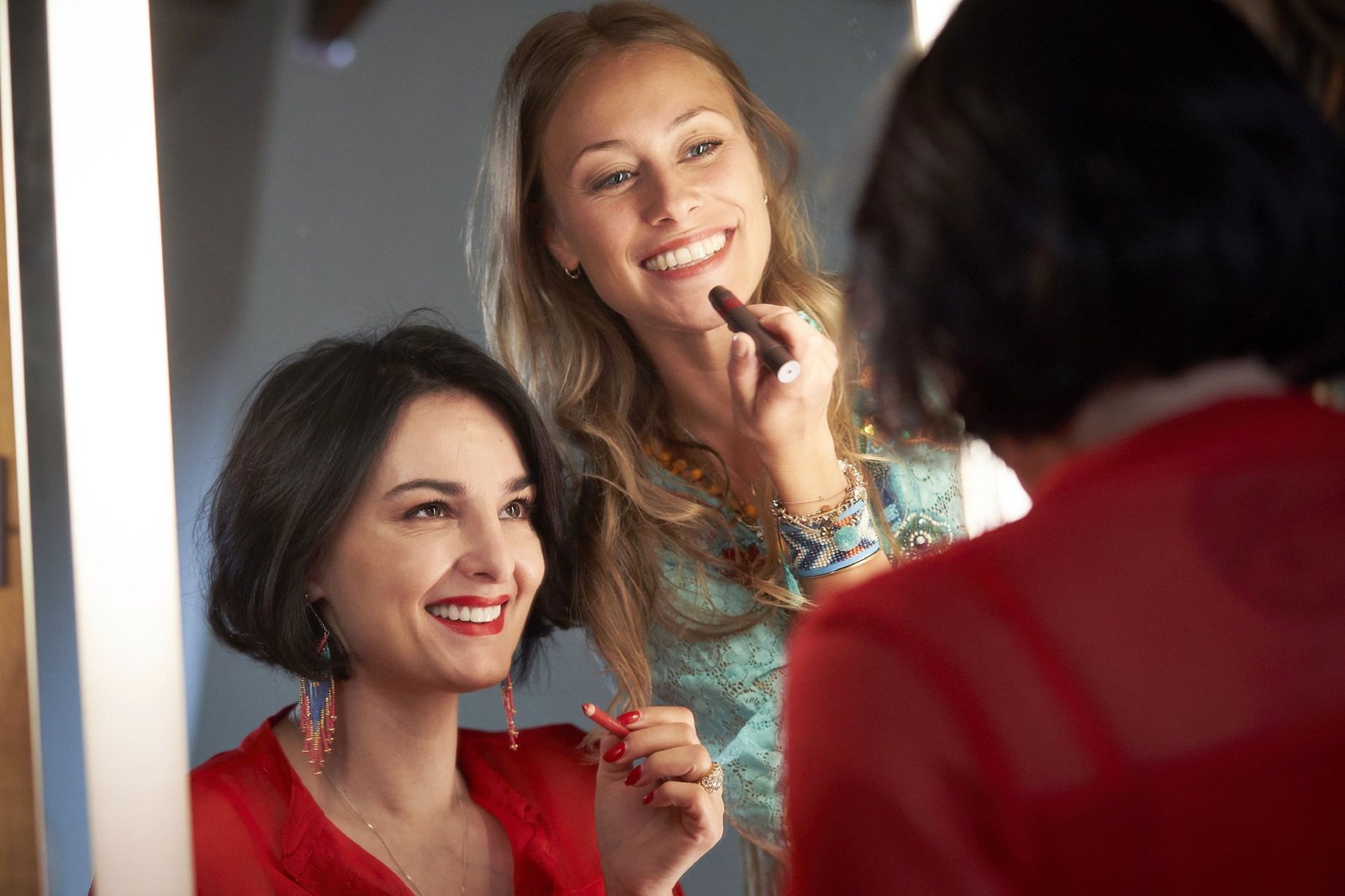 Ex-FreundinnenClaudia (Mimi Fiedler, l.) und Toni (Sina Tkotsch) machen sich vorm Spiegel ausgehfertig.Bild: © MG RTL D / Guido Engels