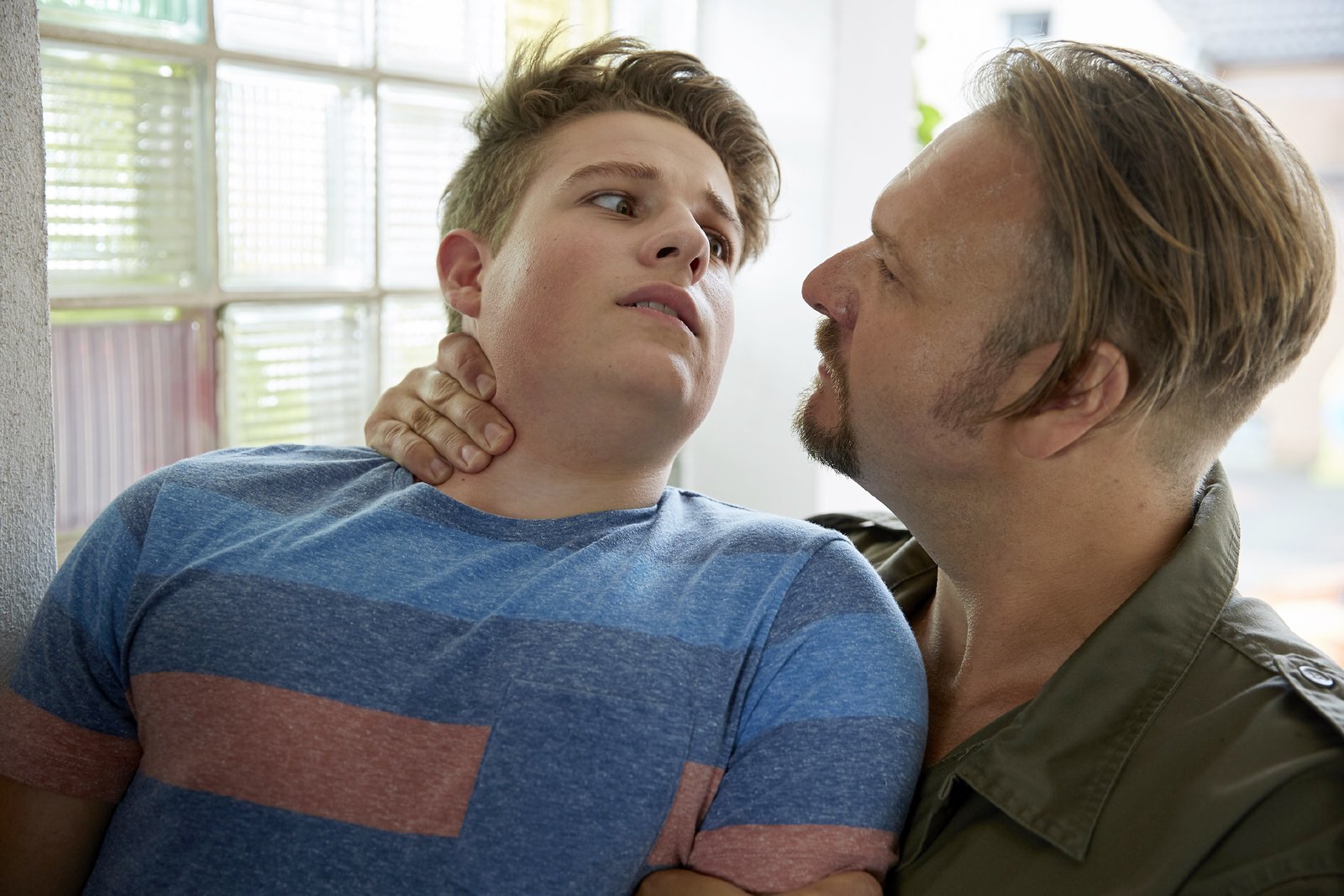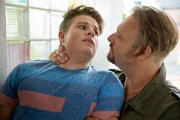Die SexgöttinNachbar Kurt (Oliver Fleischer, r.) bringt Sammy (Moritz Bäckerling) _Manieren_ bei und schmeißt ihn aus dem Haus. Sammy wollte der überforderten Marie beweisen, wie toll er küssen kann.Bild: © MG RTL D / Guido Engels