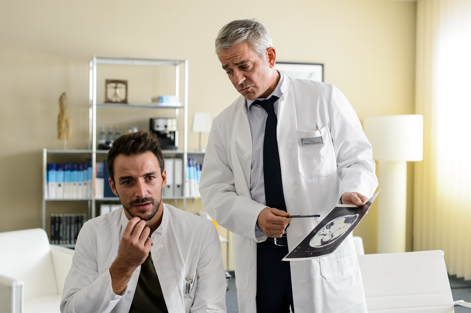 Eine Kleinigkeit zu vielDr. Frank Stern (Max Alberti, l.) und Prof. Dr. Alexander von Arnstett (Florian Fitz, r).Bild: © ZDF und Willi Weber.