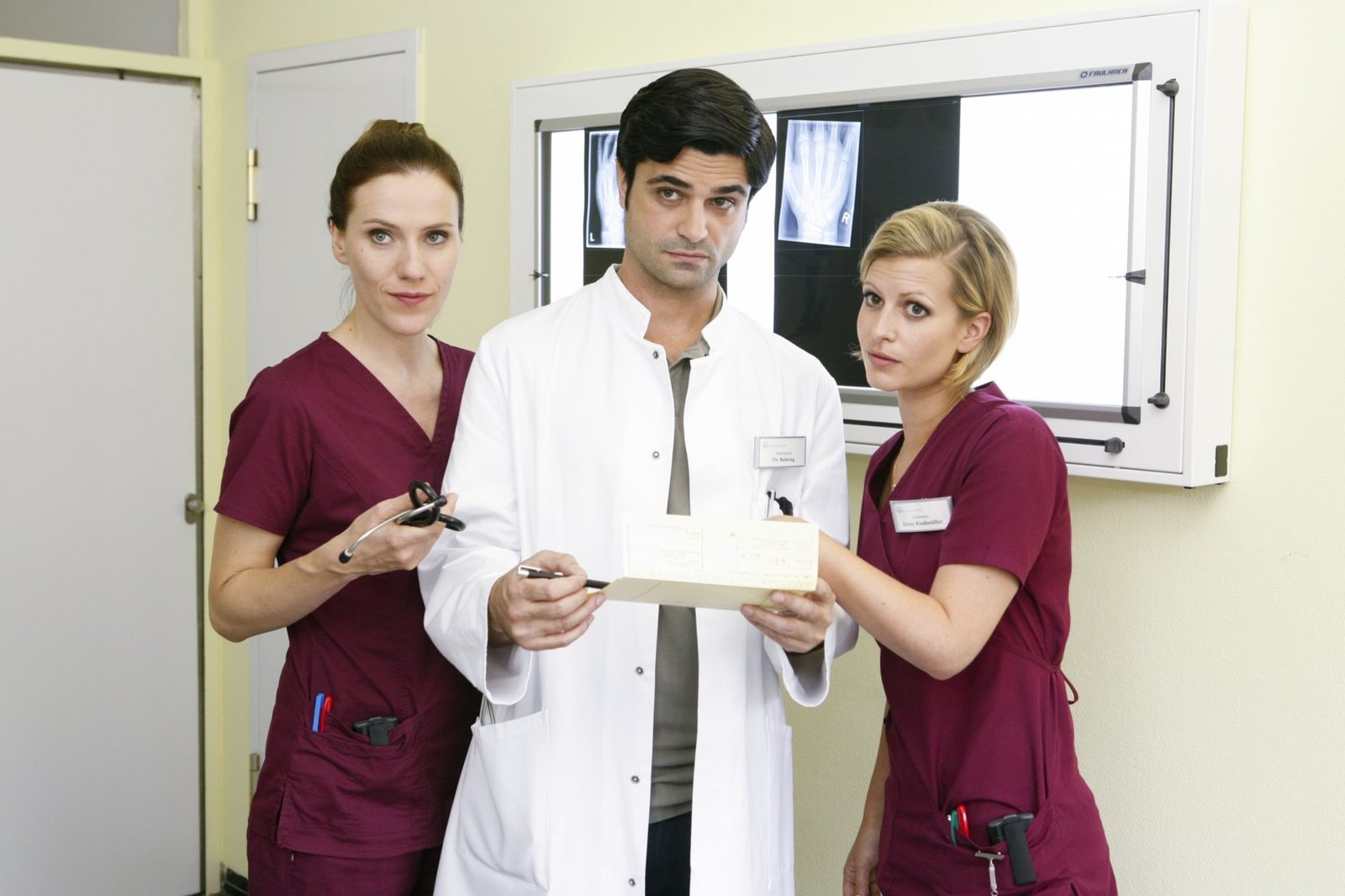 In den Rücken geschossenBettys Diagnose Pressetermin am 18.9.2014 am Set, Betty Dewald (Bettina Lamprecht), Dr. Marco Behring (Maximilian Grill), Lizzy Riedmüller (Theresa Underberg), Honorarfrei - nur für diese Sendung bei Nennung ZDF und Kai SchulzBild: © ZDF und Thomas Kost