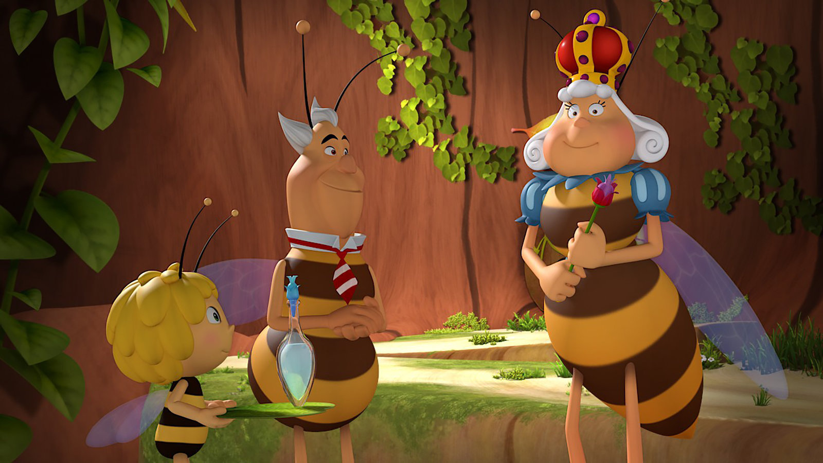 Die kranke KöniginMaja reicht der Königin den Flakon mit dem Akelei-Nektar.Bild: © ZDF und 2017 Studio 100 Animation