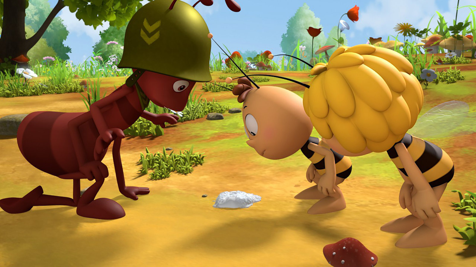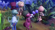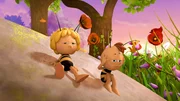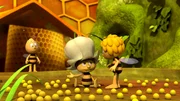 Das süße Geheimnis"Die Biene Maja", "Das süße Geheimnis." Rufus sitzt auf einem Seerosenblatt im Teich und kommt nicht mehr an Land. Maja und Willi wollen ihn an Land fliegen, nur leider ist Rufus so schwer, dass sie ihn nicht heben können. Da können nur noch die Ameisen helfen. Aber wo sind die bloß? Es ist weit und breit keine Ameise in Sicht. Maja und Willi fliegen zum Ameisennest, wo sie Emil und Egon antreffen, die ausplaudern, dass die Ameisen einen Schatz gefunden haben. Deswegen patrouillieren sie nicht wie sonst über die Wiese. Willi und Maja sind neugierig und machen sich auf die Suche. Der Schatz ist ein Berg aus Würfelzucker, der mitten in der Wiese liegt. Die Ameisen klettern darauf herum und wollen den Zucker abtragen, bevor es zu regnen beginnt. Emil und Egon verplappern sich ein weiteres Mal und schon stehen sämtliche Wiesenbewohner am Zuckerberg. Alle wollen etwas abhaben von dem köstlichen Schatz. Paul und Kurt geraten in einen Streit darüber wem der Zucker gehört. Sie beschließen eineBild: © ORF eins