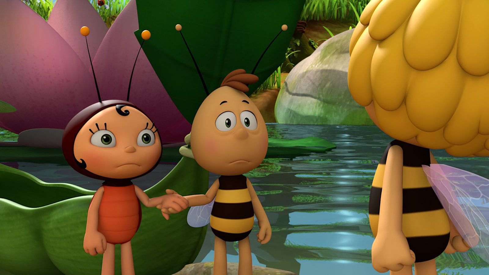 Rosalie"Die Biene Maja", "Rosalie." Fliege Walter hat im Geheimen eine kleine Kaulquappe großgezogen, die mittlerweile zu einem großen, rosafarbenen Frosch herangewachsen ist. Als Walter sich Maja und Willi anvertraut, sind diese zunächst entsetzt, bald aber von der Harmlosigkeit des süßen Frosches überzeugt. Richter Bienenwachs kann ihrer Sichtweise jedoch wenig abgewinnen. Auf schnellstem Weg versucht er das vermeintlich gefährliche Tier aus seinem Territorium zu verjagen.Bild: © ORF eins