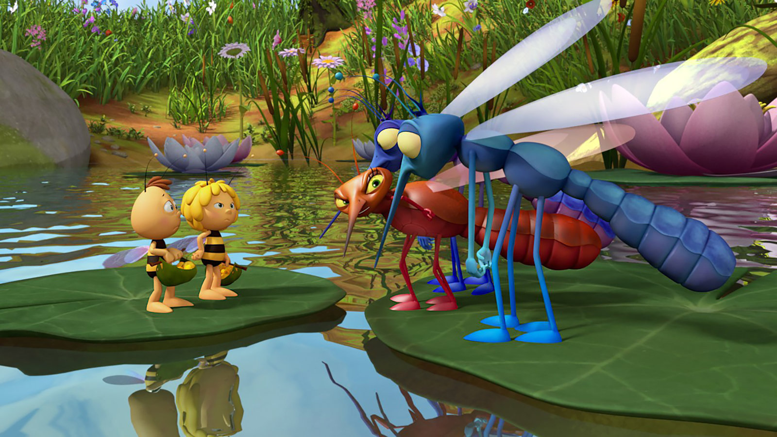 Die Wiese gehört mir!Drei Mücken beanspruchen den Teich für sich.Bild: © ZDF/Studio100 Animation