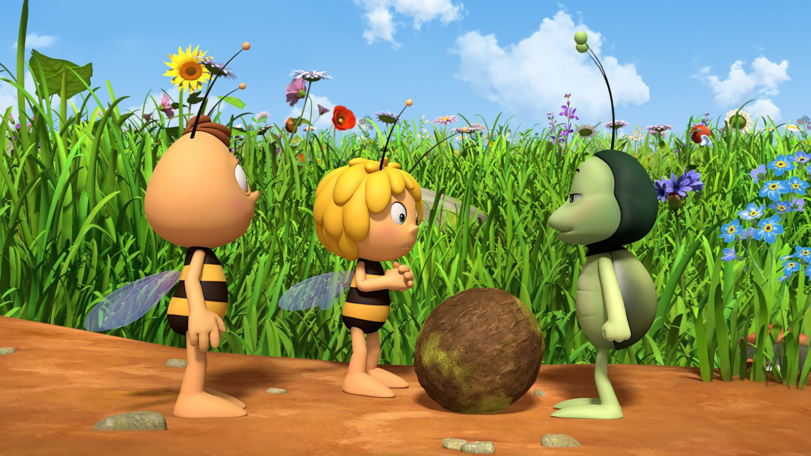 Kurt will berühmt werden"Die Biene Maja", "Kurt will berühmt werden." Maja und Willi sollen für den Unterricht bei Frau Kassandra eine Liste mit berühmten Insekten erstellen. Doch Kurt stellt fest, dass es bedauerlicherweise keinen berühmten Mistkäfer gibt. Kurt will das unbedingt ändern und selbst in die Annalen der Wiesengeschichte eingehen und zwar mit dem größten Mistball, der jemals von einem Mistkäfer gerollt wurde. Der Ball, den er rollt, ist in der Tat gigantisch seine Duftnote ist es aber leider auch. Der große Ball räuchert die ganze Wiese mit seinem Gestank ein. Doch Kurt ist stolz auf sein Werk und will ihn unter keinen Umständen vernichten. Maja muss sich etwas einfallen lassen, damit Kurt seine Meinung ändert und die Luft auf der Wiese wieder frisch und rein wird.Bild: © ORF eins