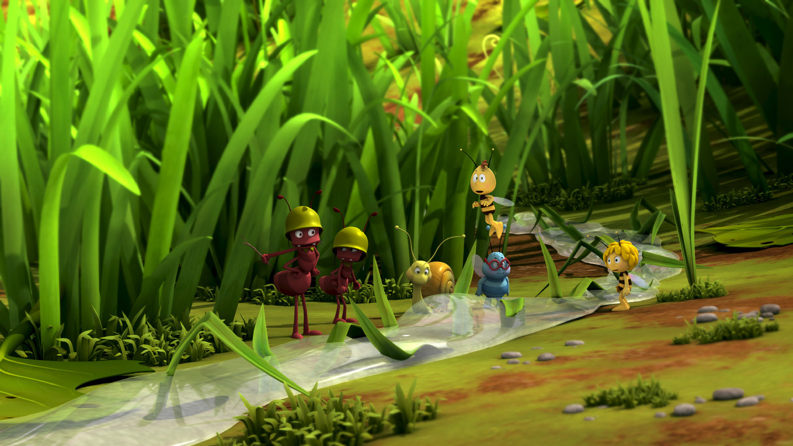 Walter schleimt sich einMaja und ihre Freunde bestaunen eine Schleimspur.Bild: © ZDF und Studio 100 Animation