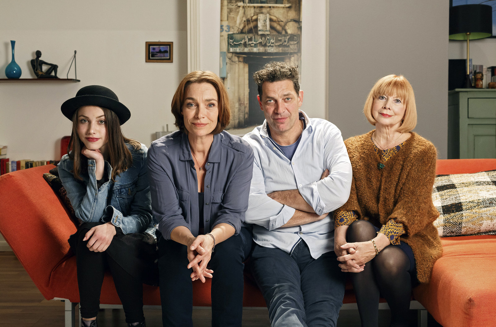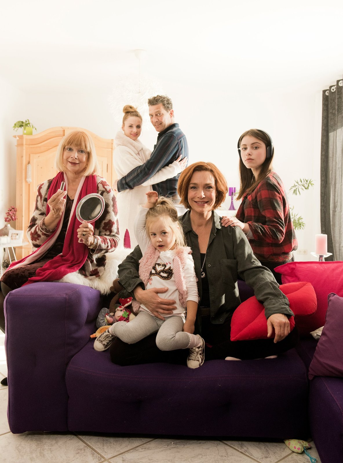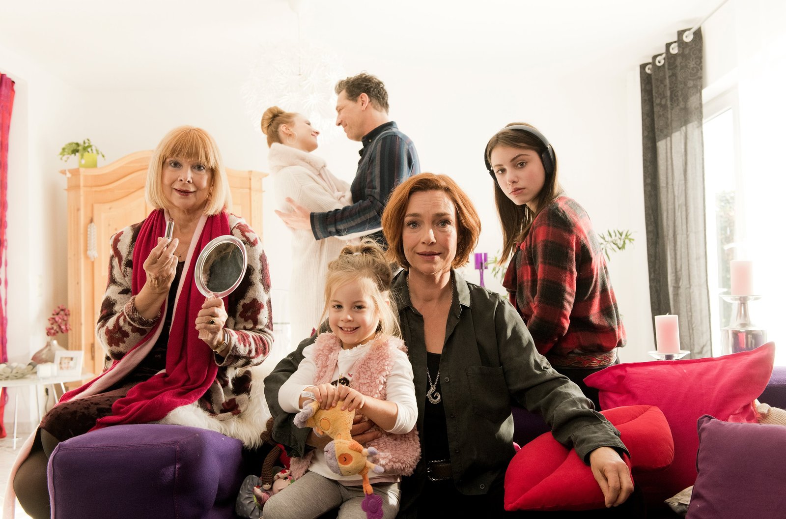 Eine gute MutterBild: Billy Kuckuck (Aglaia Szyszkowitz) im Kreis ihrer Lieben (v.l.n.r.): Christel Geuskens (Ursela Monn), Melanie Przybylski und Gunnar Kuckuck (Julia Schäfle und Gregor Bloéb, im Hintergrund), Hannah Kuckuck (Vivien Sczesny).Bild: © SWR/FFP New Media GmbH/Martin Va / SWR-Presse/Bildkommunikation