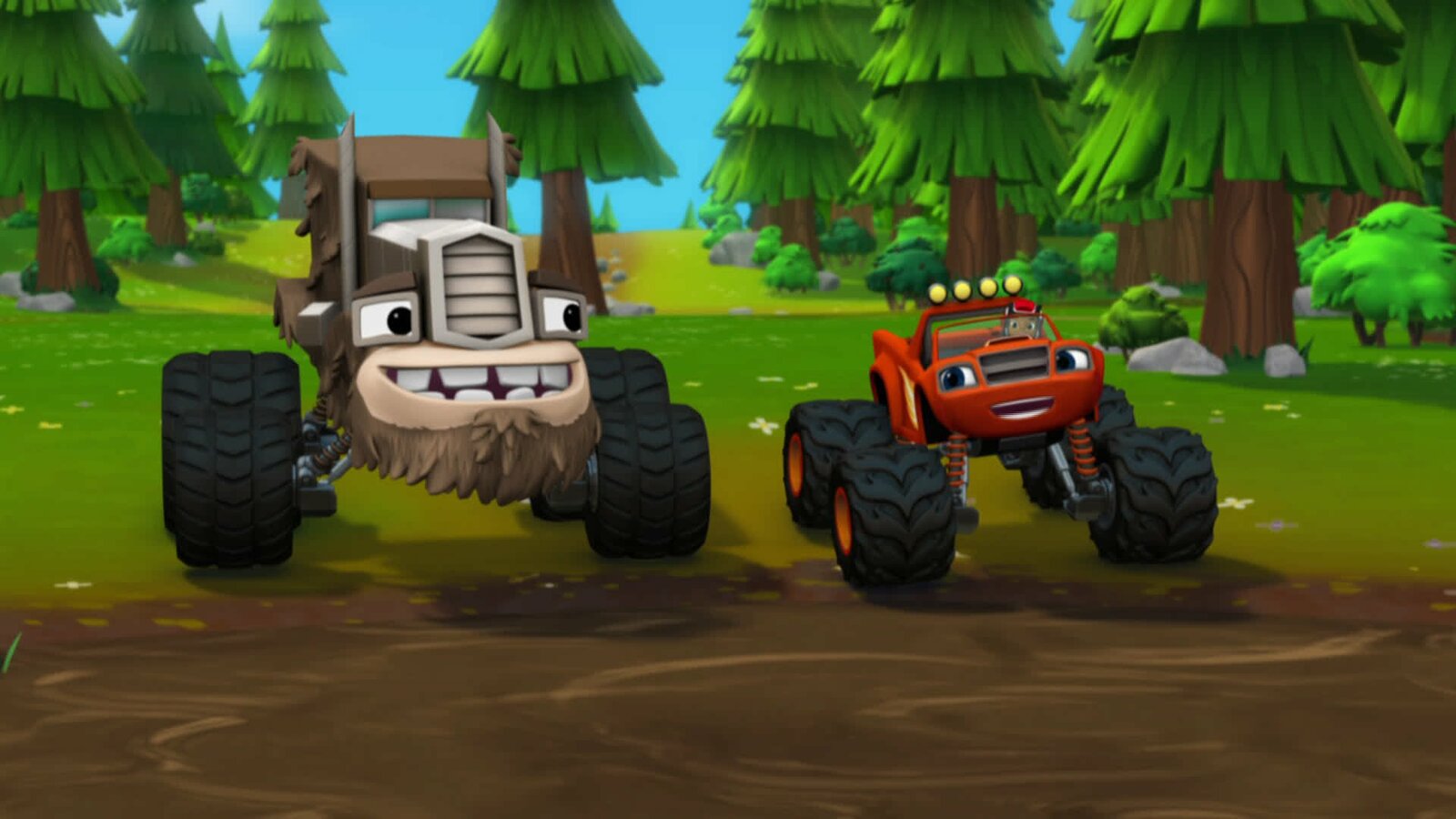 Die große MatschpartyDie Monstertrucks veranstalten eine Matschparty. Auf der Suche nach ihrem Ball lernen Blaze und AJ (re.) ihren neuen Freund Schlammbart (li.) kennen, der im Wald lebt und Matsch über alles liebt. Blaze beschließt, ihn zur Matschparty mitzunehmen.Bild: © Nickelodéon Junior
