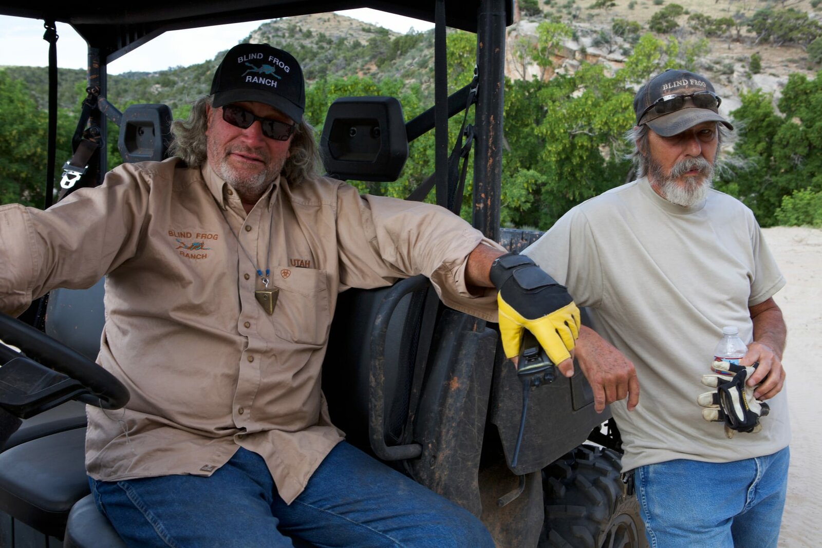 Das Gold der MormonenDuane Ollinger (l.) sitting in a four wheeler while Charlie Snider (r.) leans against it.Bild: © Discovery Communications, LLC / Discovery Channel
