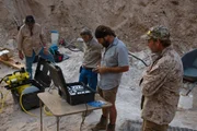 Eine vielversprechende SpurDuane Ollinger, Charlie Snider and Eric Drummond look on as Chad Ollinger operates equipment at dusk.Bild: © Discovery Communications, LLC / Discovery Channel