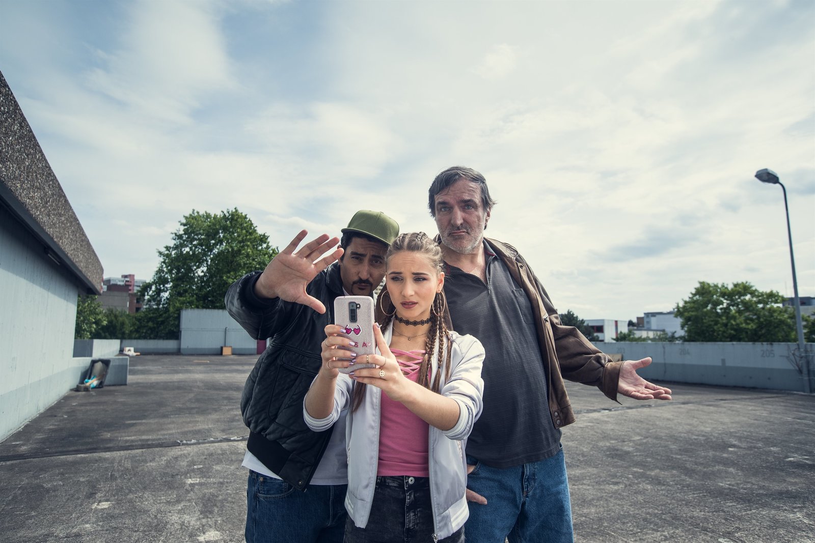 AbschiedFotosession mit Folgen: Sol (Eko Fresh, l.), Lisa (Cosima Henman, M.) und Ronald (Andreas Hoppe, r.).Bild: © ZDF und Efe Cetinoezman