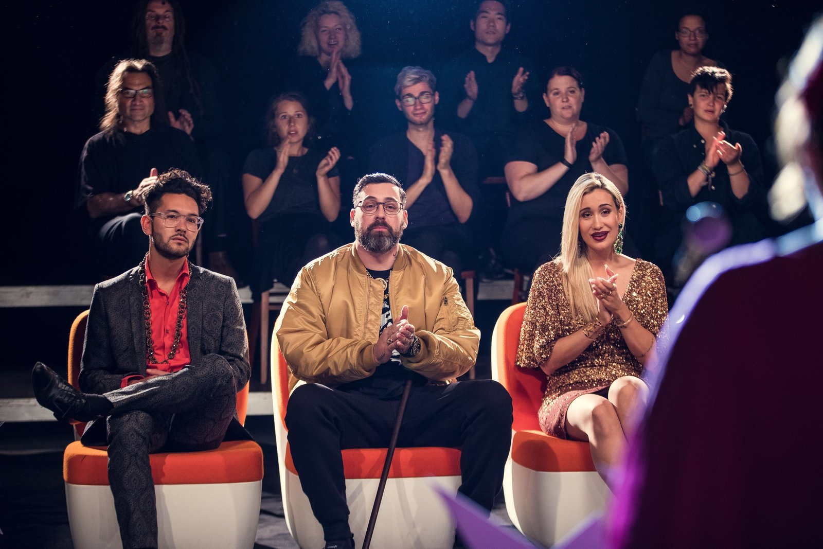 TalentÜberraschung: Die Jury hat mit dem Auftritt von Madita (Martina Eitner-Acheampong, vorne rechts im Anschnitt) nicht gerechnet. Gorilla (Paul Hartmut Würdig „Sido“, M.) und Jurorin (Sahra Bora, r.) sind begeistert.Bild: © ZDF und Efe Cetinoezman