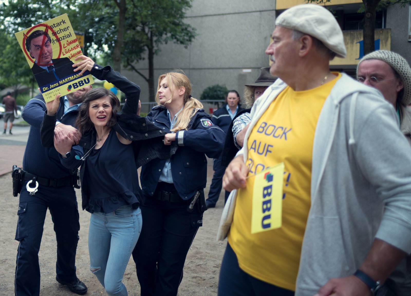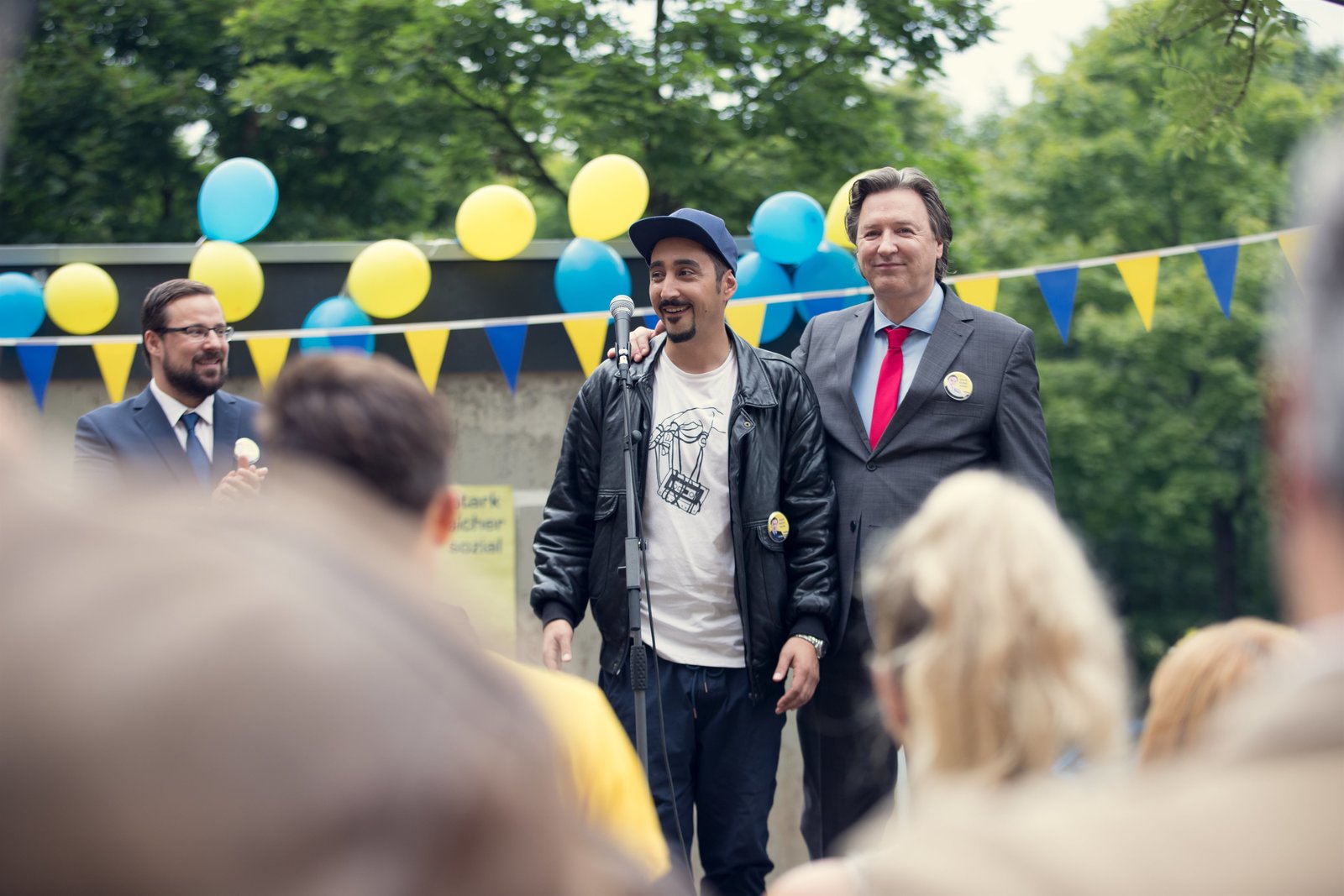 BürgermasterSol (Eko fresh, l.) hält eine Rede über Hartmann (Martin Armknecht, r.).Bild: © ZDF und Efe Cetinoezman