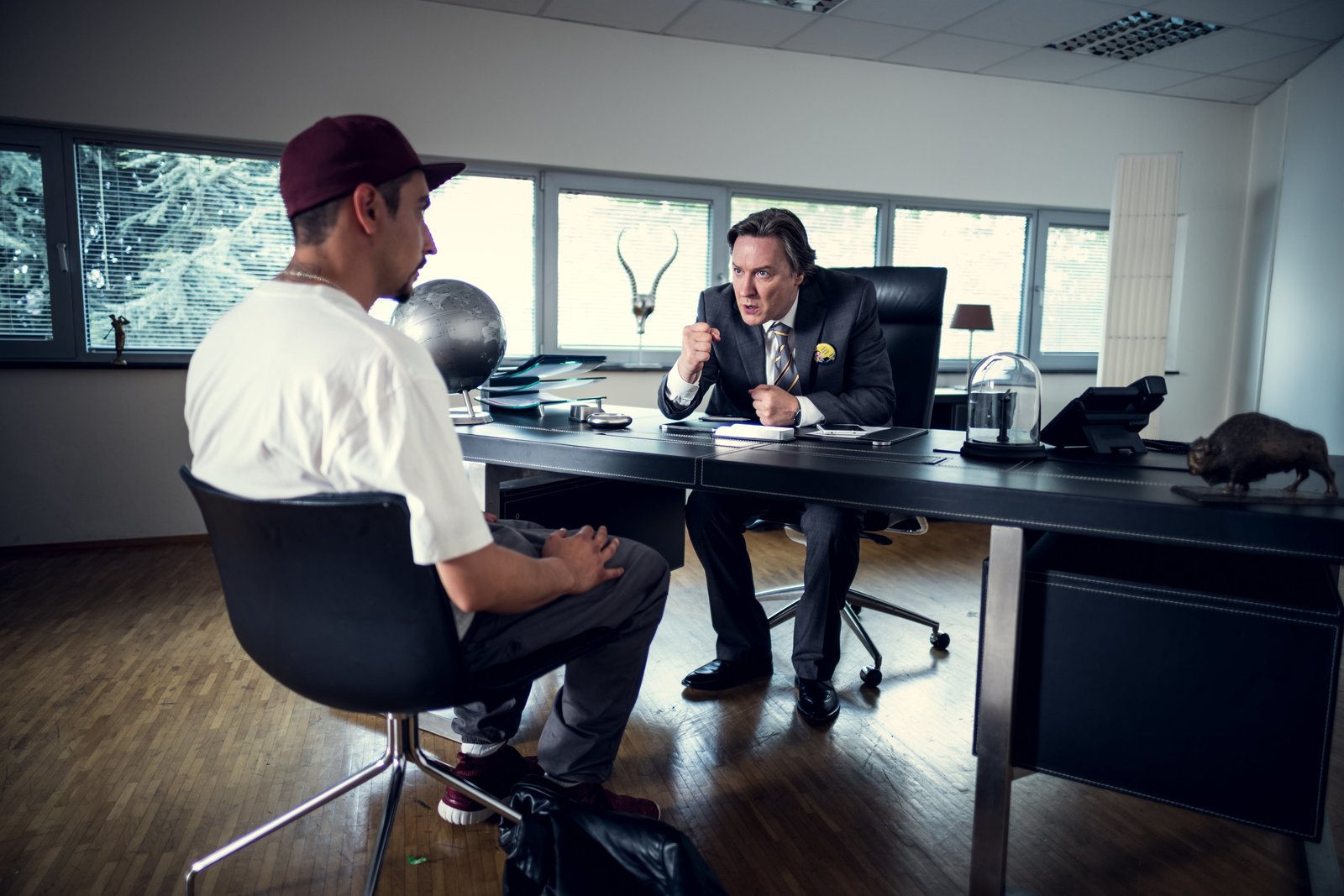 BürgermasterDr. Jens Hartmann (Martin Armknecht, r.) überzeugt Sol (Eko Fresh, l.), für ihn zu arbeiten.Bild: © ZDF und Efe Cetinoezman