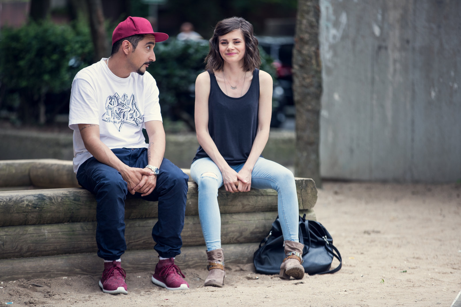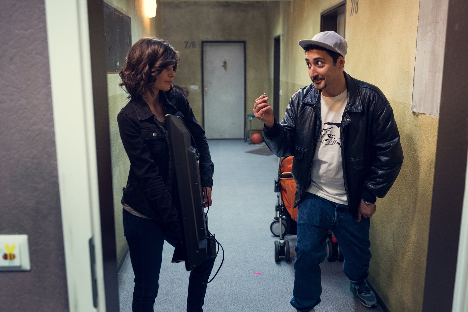 ComebackFlirtversuche im Hausflur: Mit charmanten Gesten versucht Sol (Eko Fresh, r.), Jessica (Joyce Ilg, l.) zurückzugewinnen.Bild: © ZDF und Efe Cetinoezman