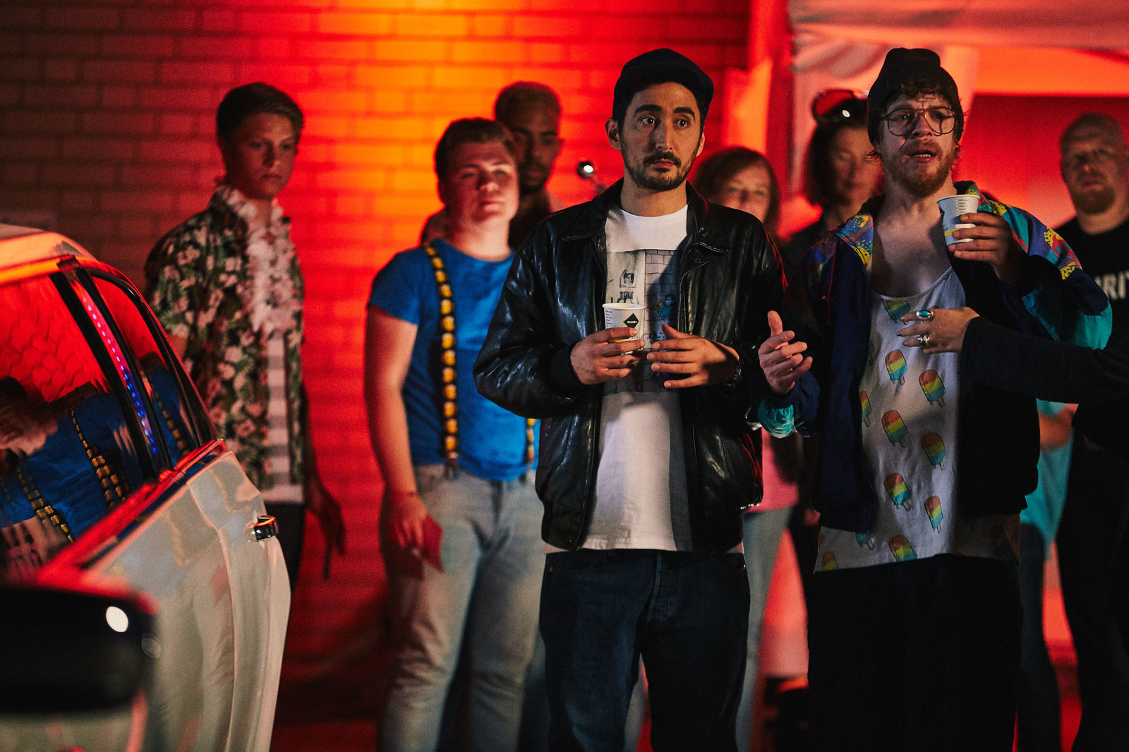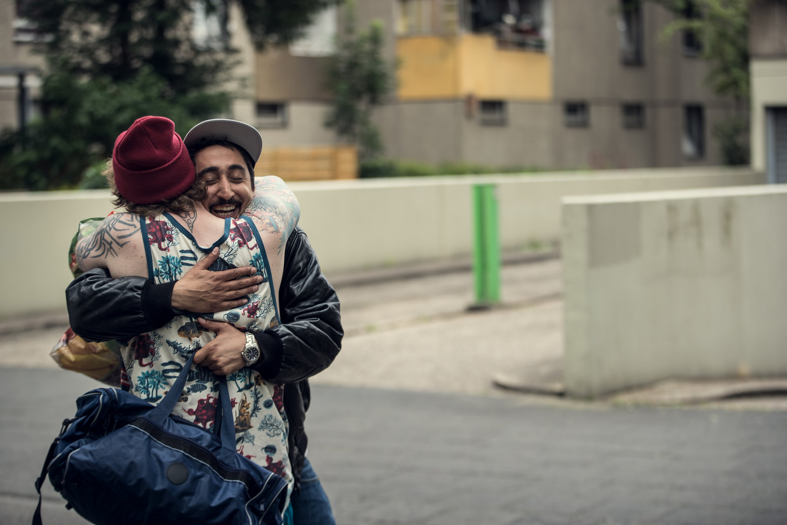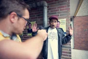 ComebackWiedersehensfreude: Nachdem er aus dem Gefängnis entlassen wurde, fallen sich Sol (Eko Fresh, l.) und Best Buddy Hardy (Sascha Reimann, v. hinten) in die Arme.Bild: © ZDF und Efe Cetinoezman