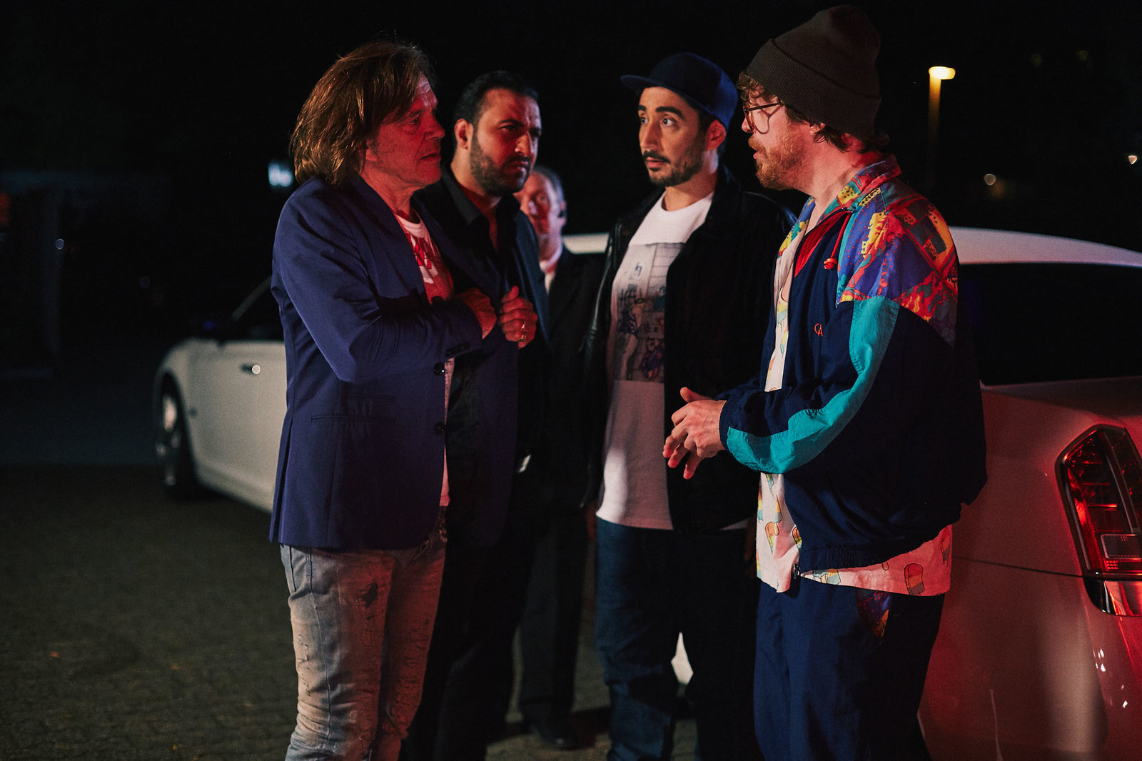ElternSol (Eko Fresh, 2.v.r.), Hardy (Sascha Reimann, r.), Jürgen Drews (Jürgen Drews, l.) und Security von Jürgen Drews (Sami Nasser, 2.v.l.).Bild: © ZDF und Efe Cetinoezman