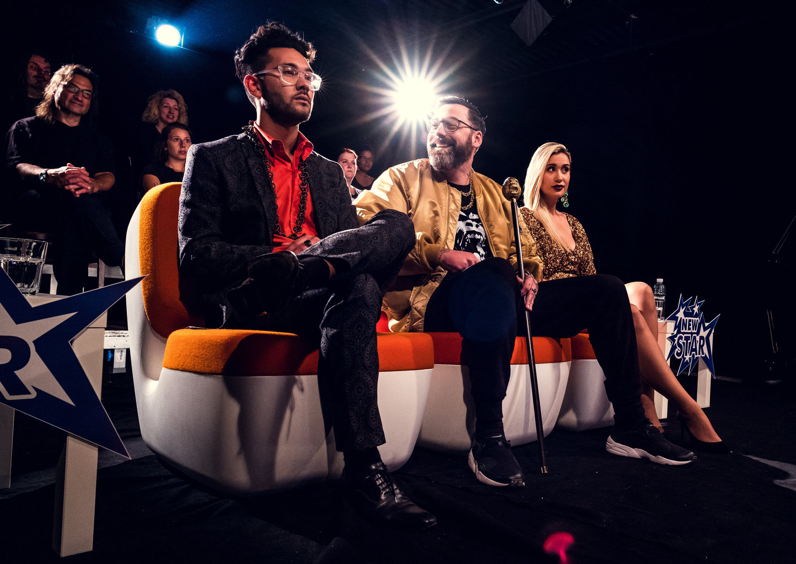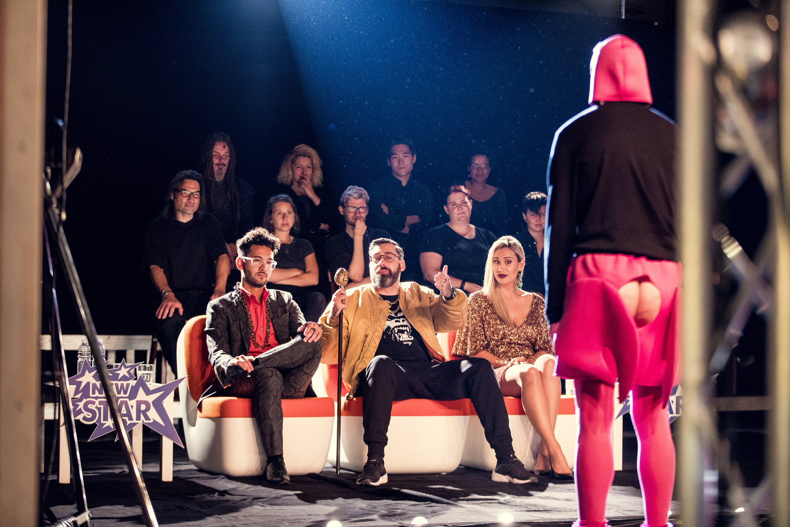 Talent„New Star“- Jury wartet auf Maditas Auftritt: Gorilla (Paul Hartmut Würdig „Sido“, M.) und Jurorin (Sahra Bora, r.).Bild: © ZDF und Efe Cetinoezman
