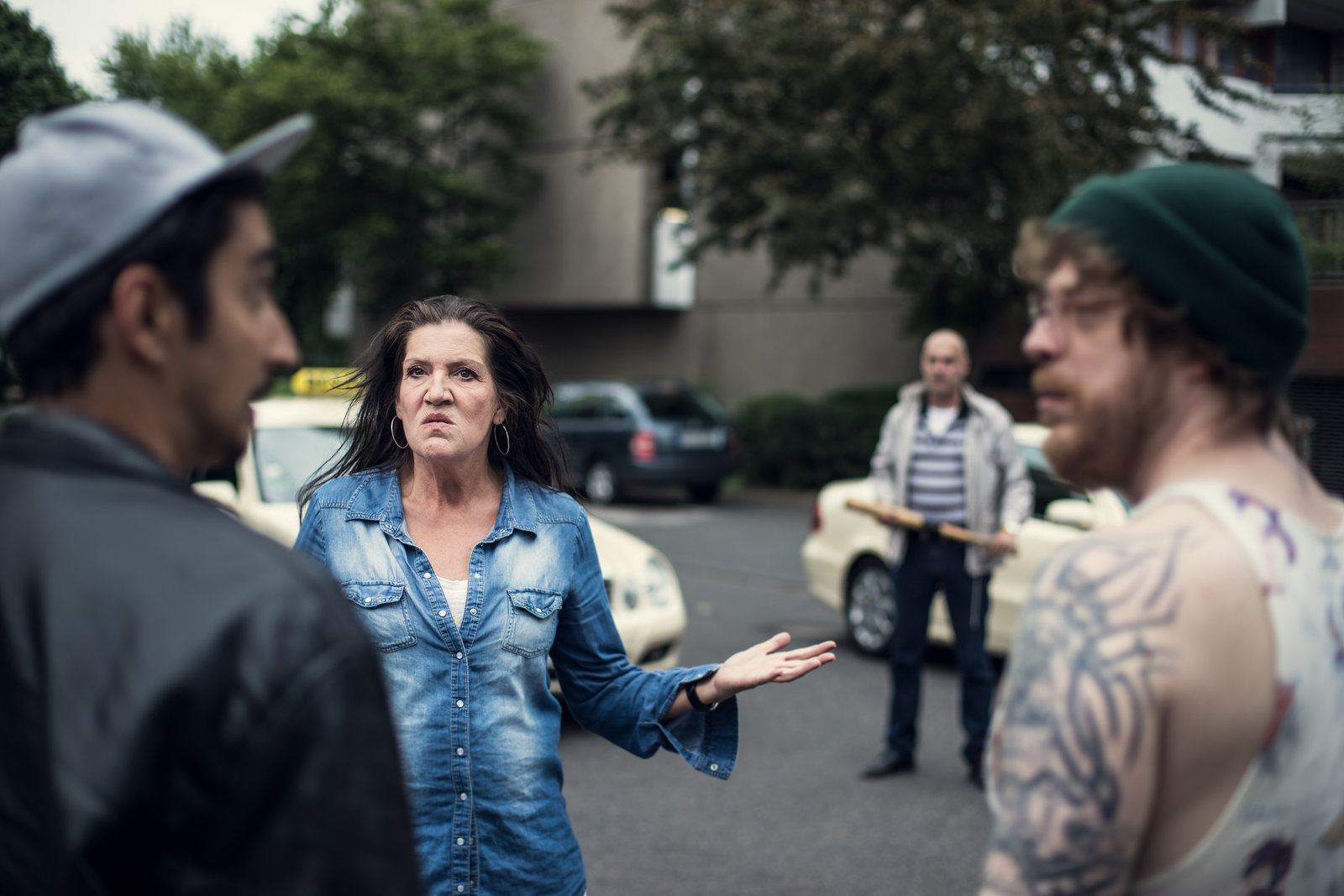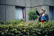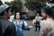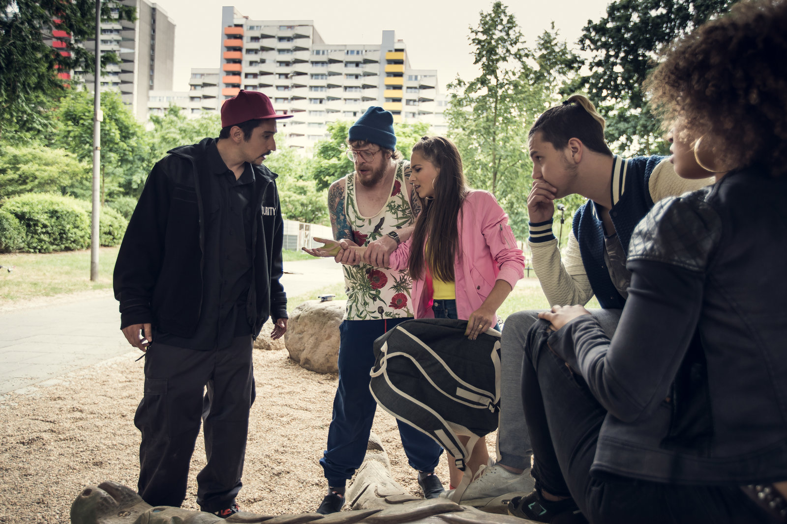 SecuritySol (Eko Fresh, l.) und Hardy (Sascha Reimann, 2.v.l.) suchen nach dem Sprüher, der die Wände im Viertel verunstaltet. In Verdacht gerät auch Lisa (Cosima Henman, M.).Bild: © ZDF und Efe Cetinoezman