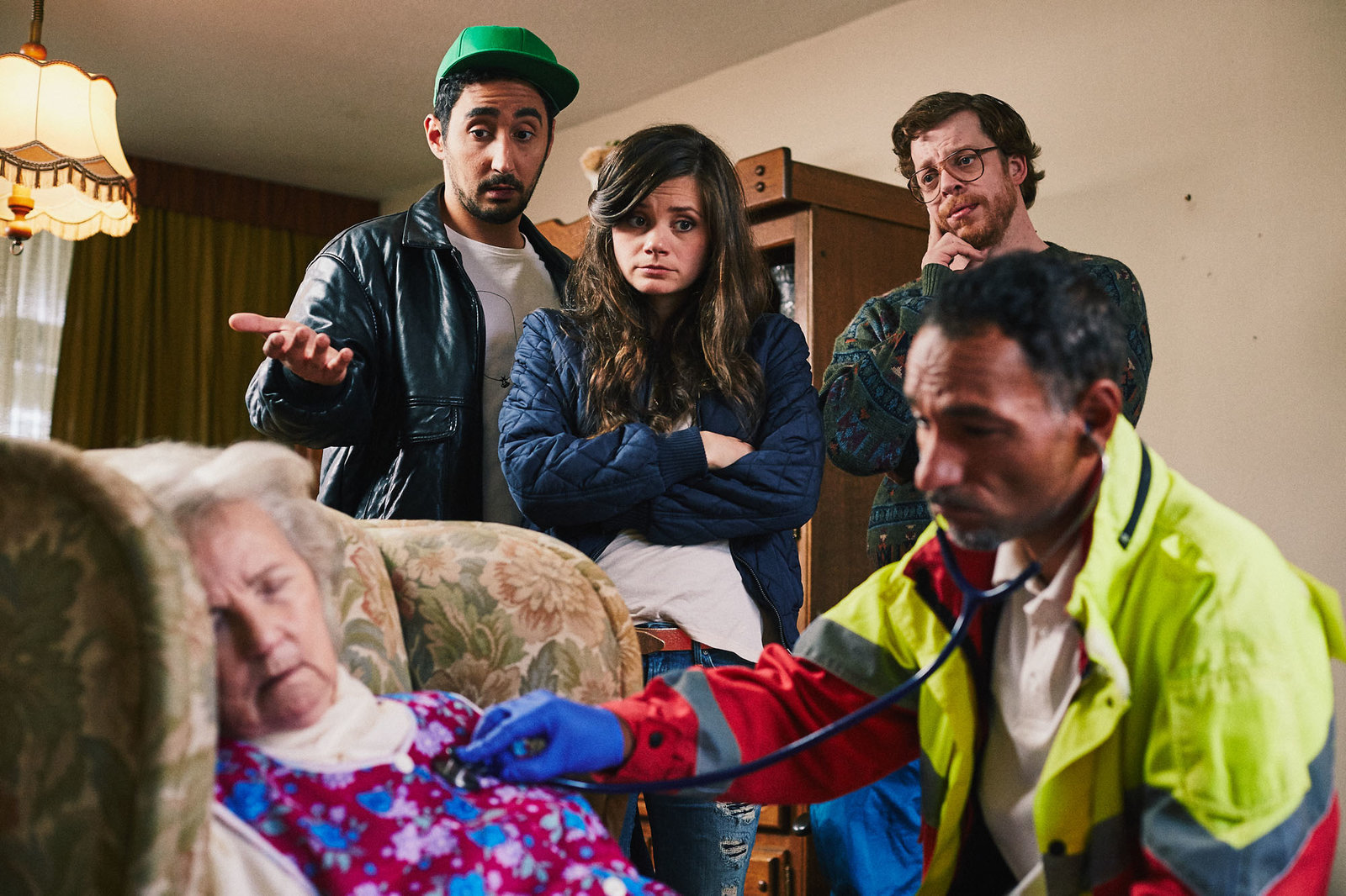 VersicherungJessica (Joyce Ilg, M.), Sol (Eko Fresh, 2.v.l.), Hardy (Sascha Reimann, 2.v.r.), Notarzt (Raschid Sidgi, r.), Frau Geier (Gerda Böken, l.).Bild: © ZDF und Efe Cetinoezman
